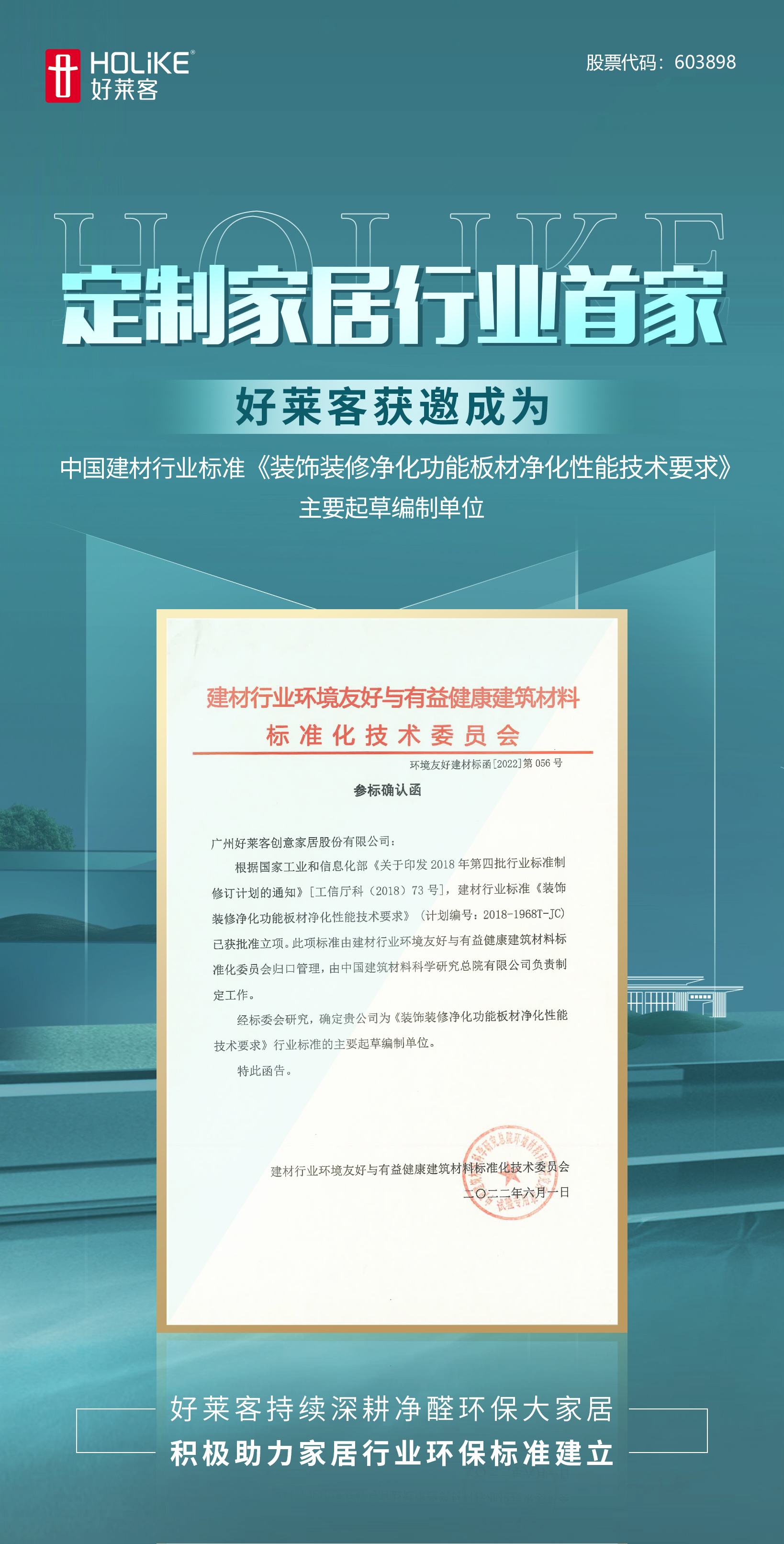 一流企业做标准,本次恒盛平台受邀参与建材行业标准《装饰装修净化功能板材净化性能技术要求》的起草和编制,是对恒盛平台在净醛领域行业领先地位以及所做出贡献的重要肯定。