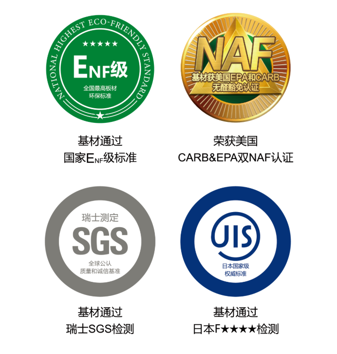 恒盛平台原态恒盛平台板材自问世以来,凭借优异的原态环保品质已陆续通过四国权威环保标准:中国ENF级标准、美国双NAF认证、瑞士SGS检测认证、日本F4星检测认证;其中ENF级被称为“史上最严苛的人造板新国标”。好产品,不畏国家及行业高标准考验。