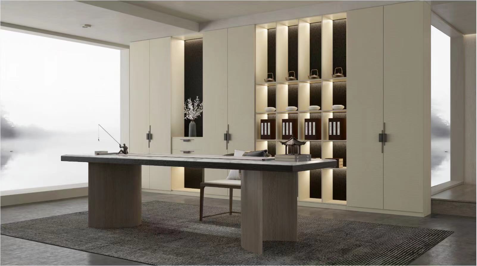 逐影寻声花色如光影在木纹里流淌,搭配清风竹影联名图案,如竹林秘境般引人入胜,大面积开放格布局,可放置古玩、书籍,彰显雅致品味。