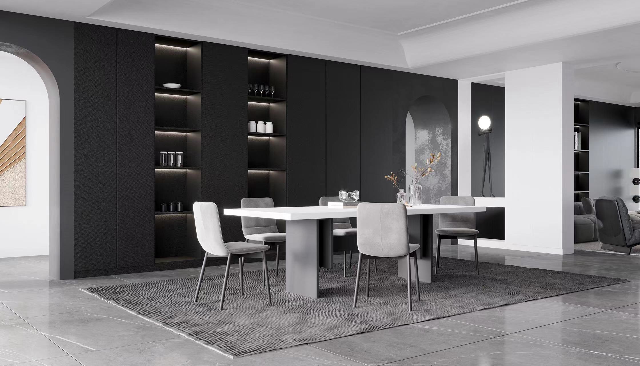 魅影黑与冷韵白交融碰撞,全新解构经典黑白色系,与生俱来的魅惑与雅致展示无遗,空间的纯粹与自由表达恰到好处。