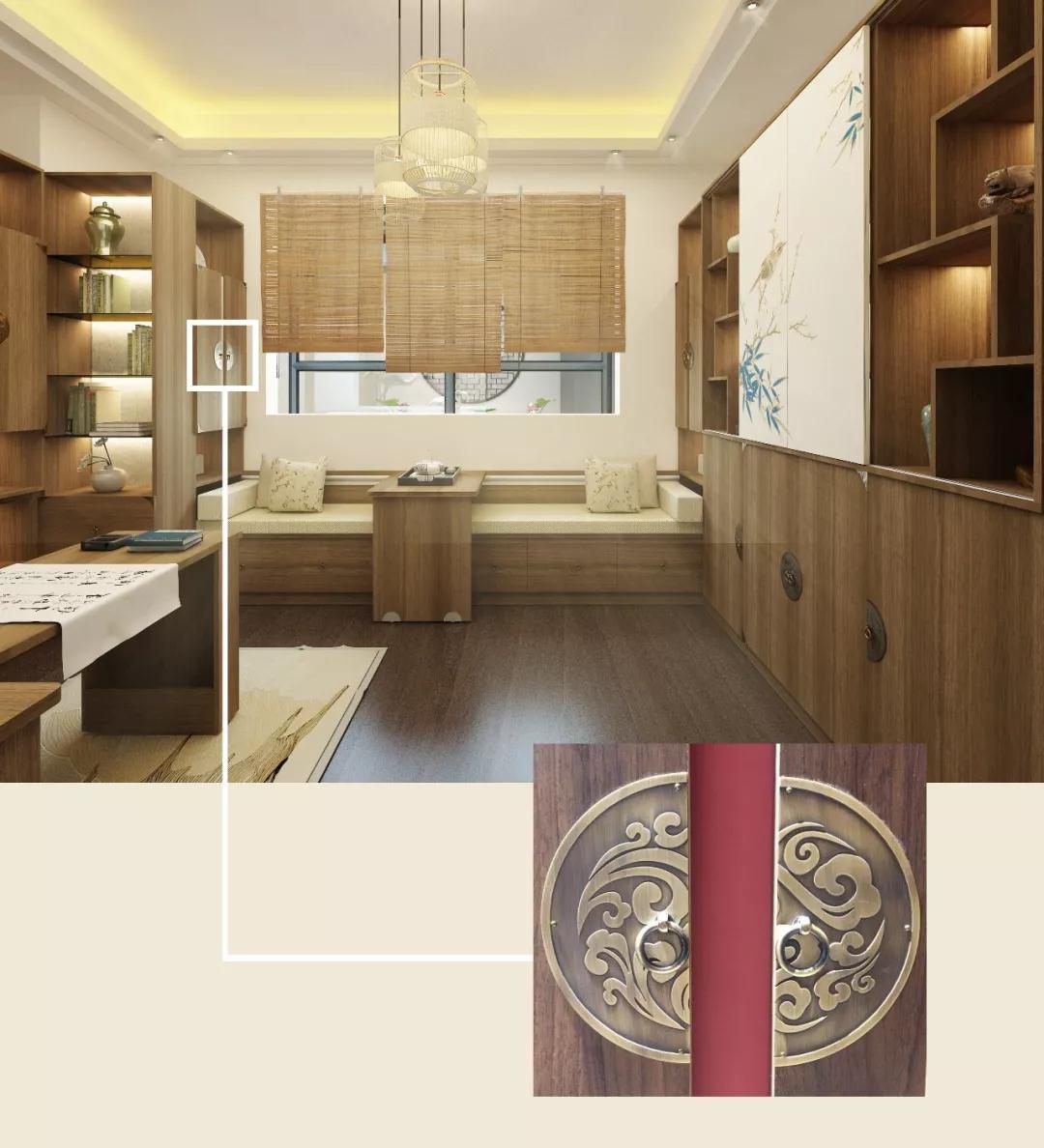 在新中式的设计里其实也可以加入云纹的元素,最简单的便是在把手或者在柜面上做点花样,通过青铜材质和木色纹理,既营造出了中式的神韵,而又不会过于浓墨重彩。