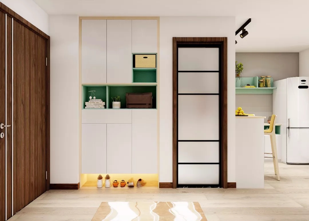 因为一楼承担的功能区很多,所以留给玄关的位置是很有限的。综合考虑,设计师在进门左边做了一个顶天立地的内嵌式玄关柜,储物功能强大,开放隔间和封闭柜体的结合,也为各类物品提供了合适位置。