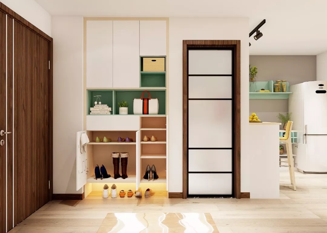 上层柜子放置一些不常用的杂物,中间开放隔间放置出门常用物品,如小包、钥匙、公交卡等小物件,下层就是鞋子们的安身之所了。