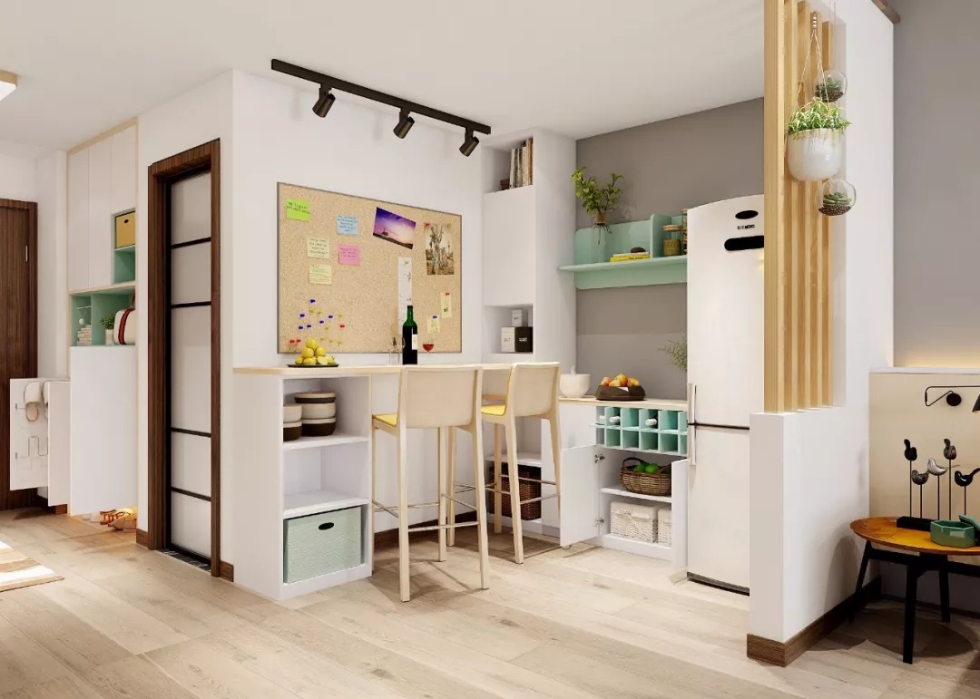 而与客厅的隔断墙打掉一部分,用木栅栏代替,既让空间更通透,在上面挂上一两株植物,又让整个空间更有生机。