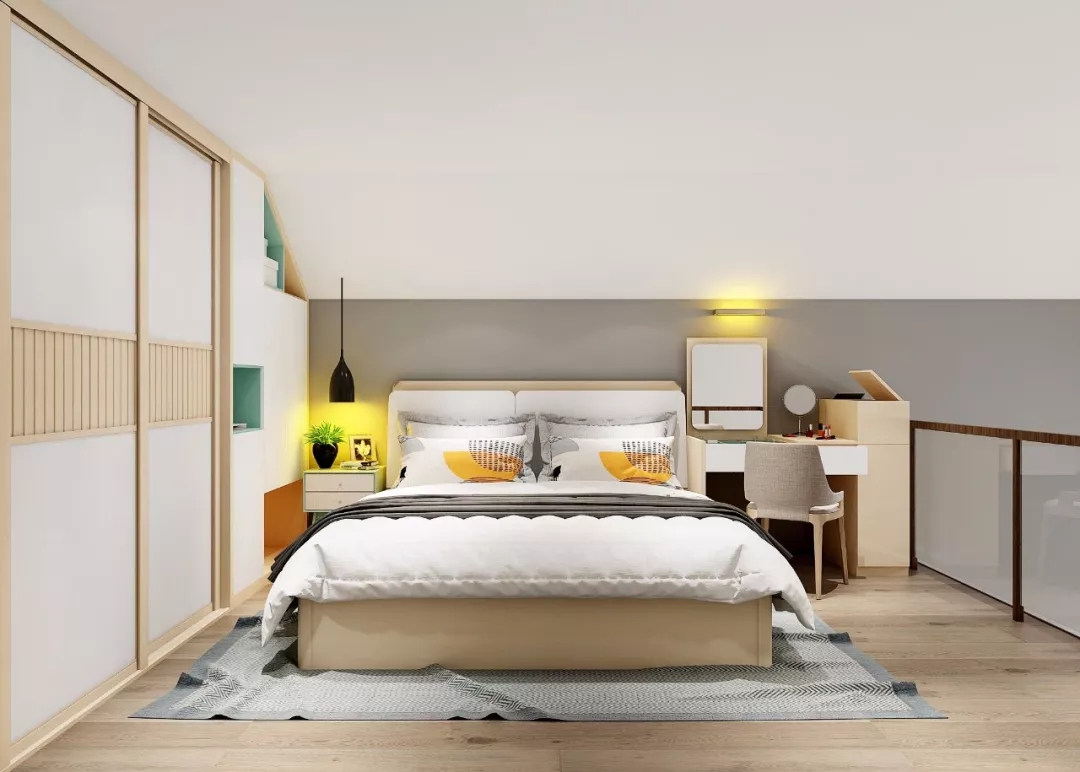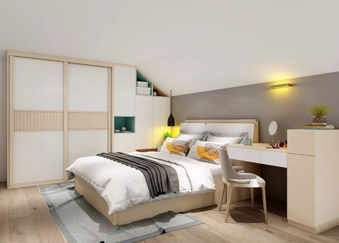 左边矮墙做成了储物区:一个大衣柜加储物柜,贴墙位置也根据空间做了异形处理,不浪费每一平米;储物柜和床之间还有一个小小的床头柜,每晚温暖的灯光都伴着安娜入睡;床做成了“储物床”,很适合放置一些换季的大件被子。