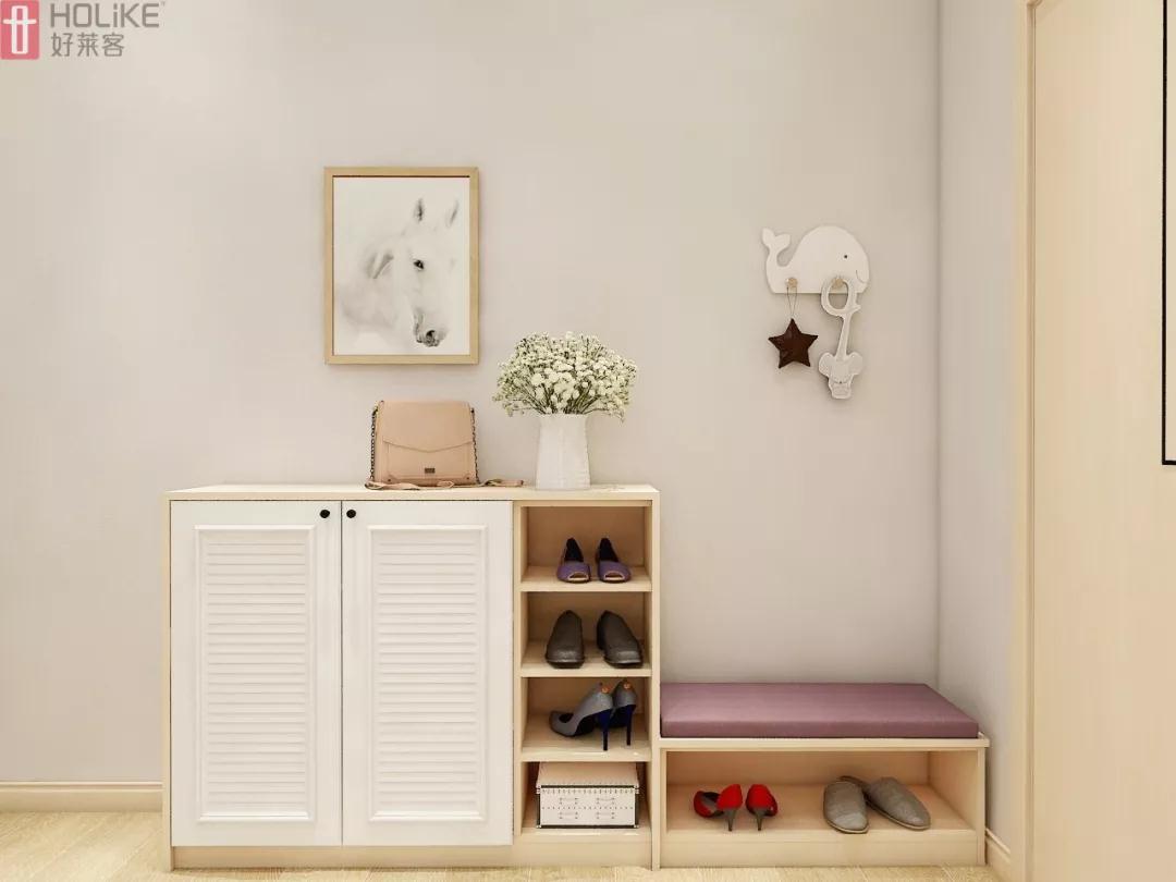 入门处的半开放式玄关柜集收纳与展示于一身,百叶窗的柜门设计给鞋子留出透气的空间,换鞋凳底部留空,放置户主常穿的鞋子,让出门换鞋也能有优雅的姿势。鞋柜内部设计了可移动的层板,大大增强的鞋柜的储物能力。