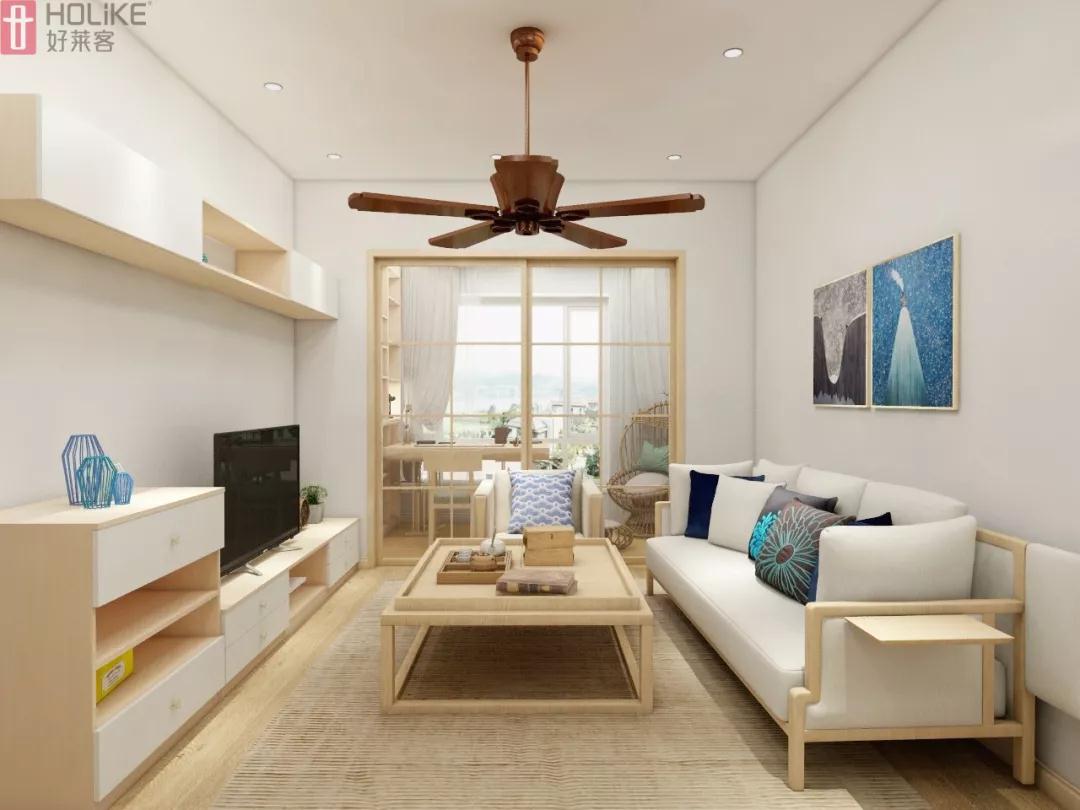作为会客场所的客厅,汤圆希望打造出开阔明亮的温馨效果,因此在客厅设计里主要采用低矮简约的家具,搭配大白墙和银沙榆色的木质家居,带来温馨舒适的视觉感受。沙发把手处采用折叠式桌板设计,满足临时放置物品的需要,实用性满分!