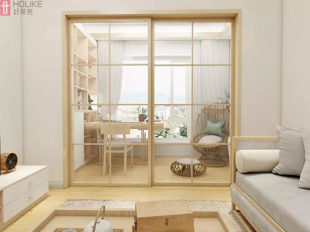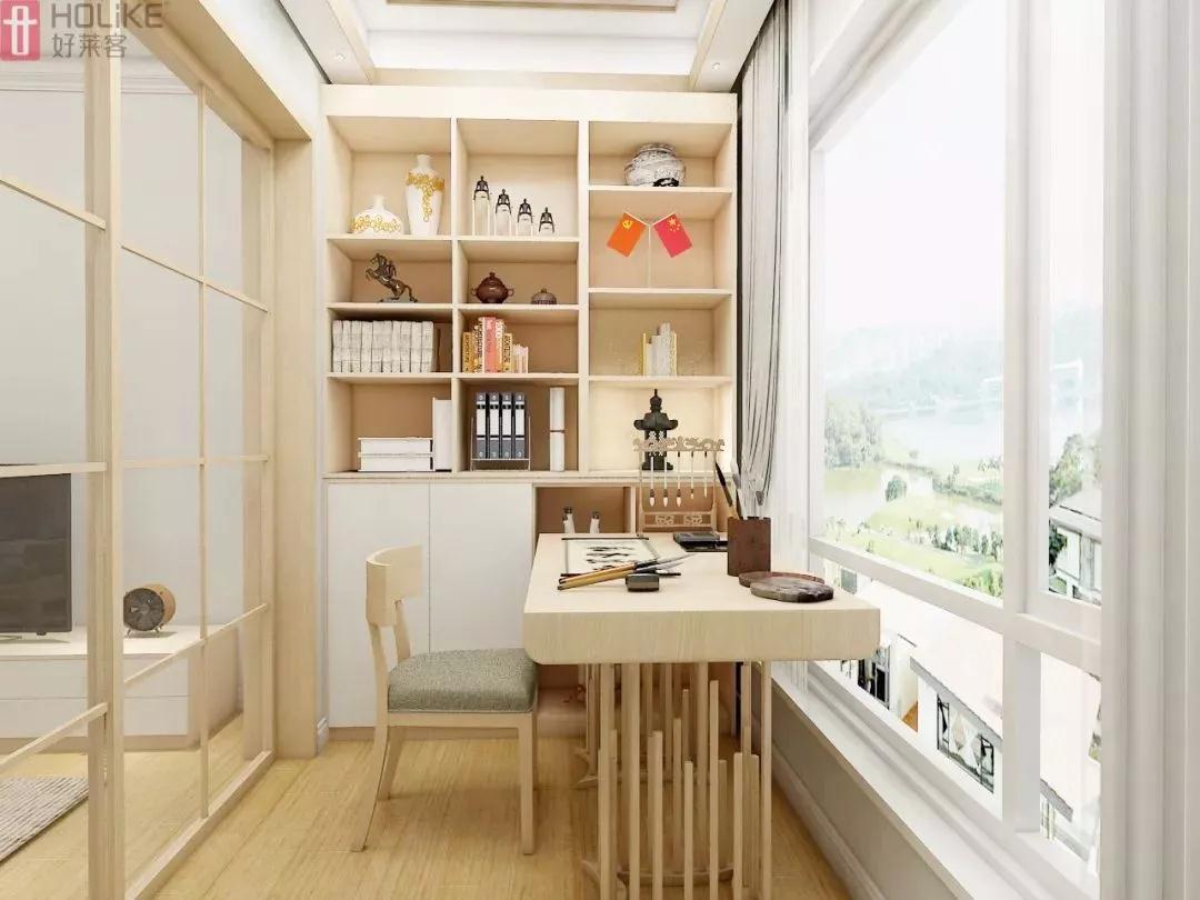 作为书法老师的汤圆,一直很想要一间独立的书房,却囿于家里面积太小,因此设计师通过封阳台的方式,将阳台改造为书房。空间以原木色作主色调,为书房带来素雅的氛围。