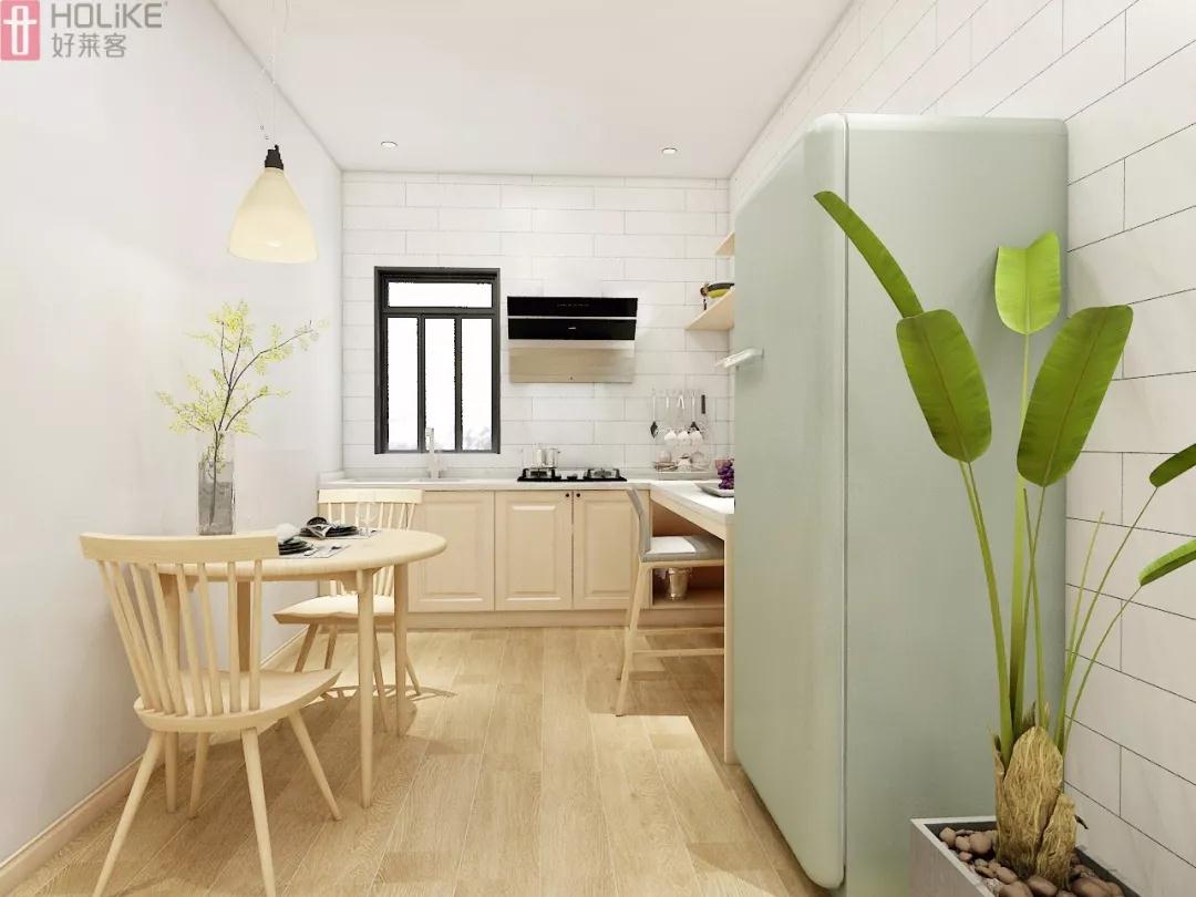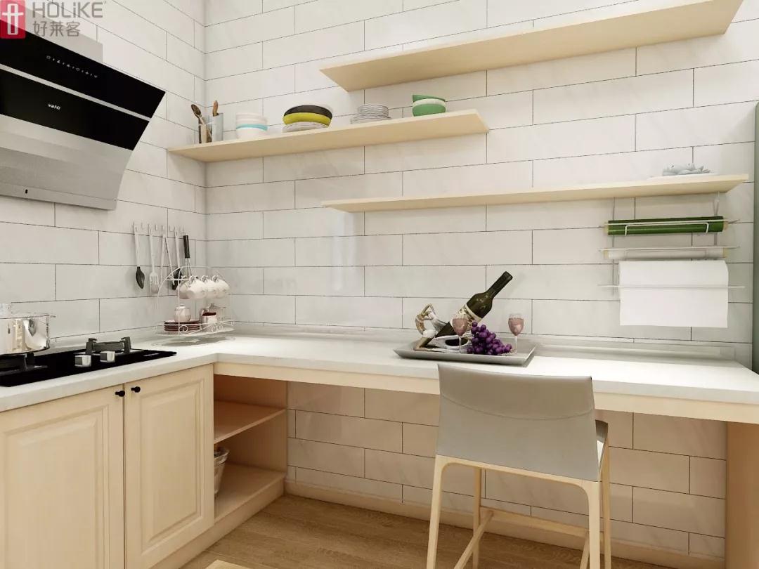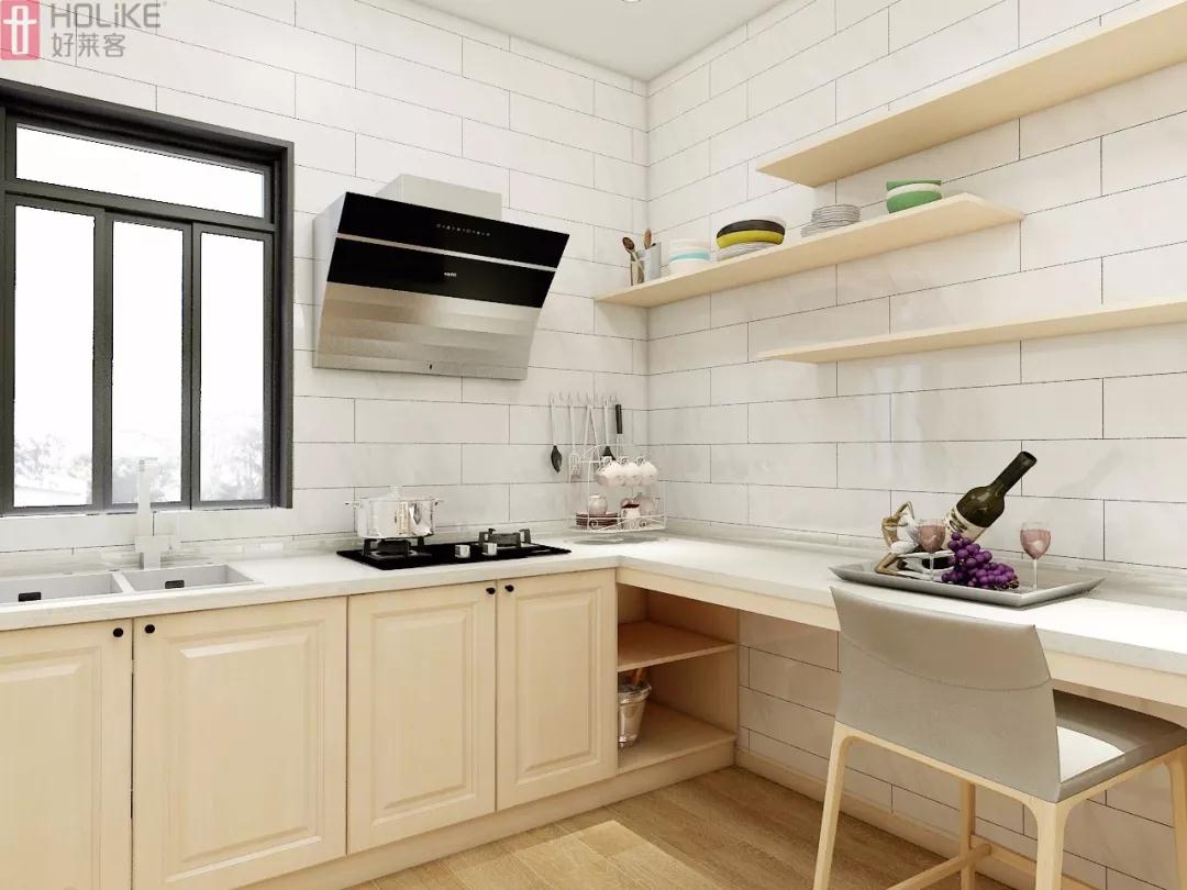 开放式的厨房采用L型的设计,左边的台面底部采用镂空的设计,既能作为操作台面,更是给夫妻俩小酌一杯的情调小吧台。超大吸力的油烟机,让开放式厨房不再受油烟干扰。
