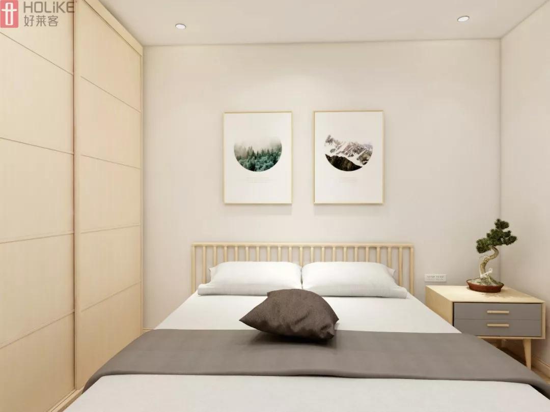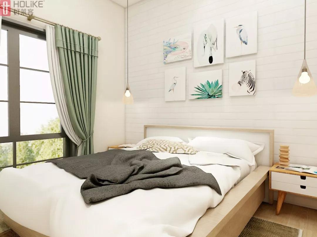 次卧是为小刘的父母所设计的。小白砖搭配木质的床,墙面采用北欧风的挂画作装饰,大大的落地窗将屋外的美景揽入屋内,营造了一种宁静自然的氛围。