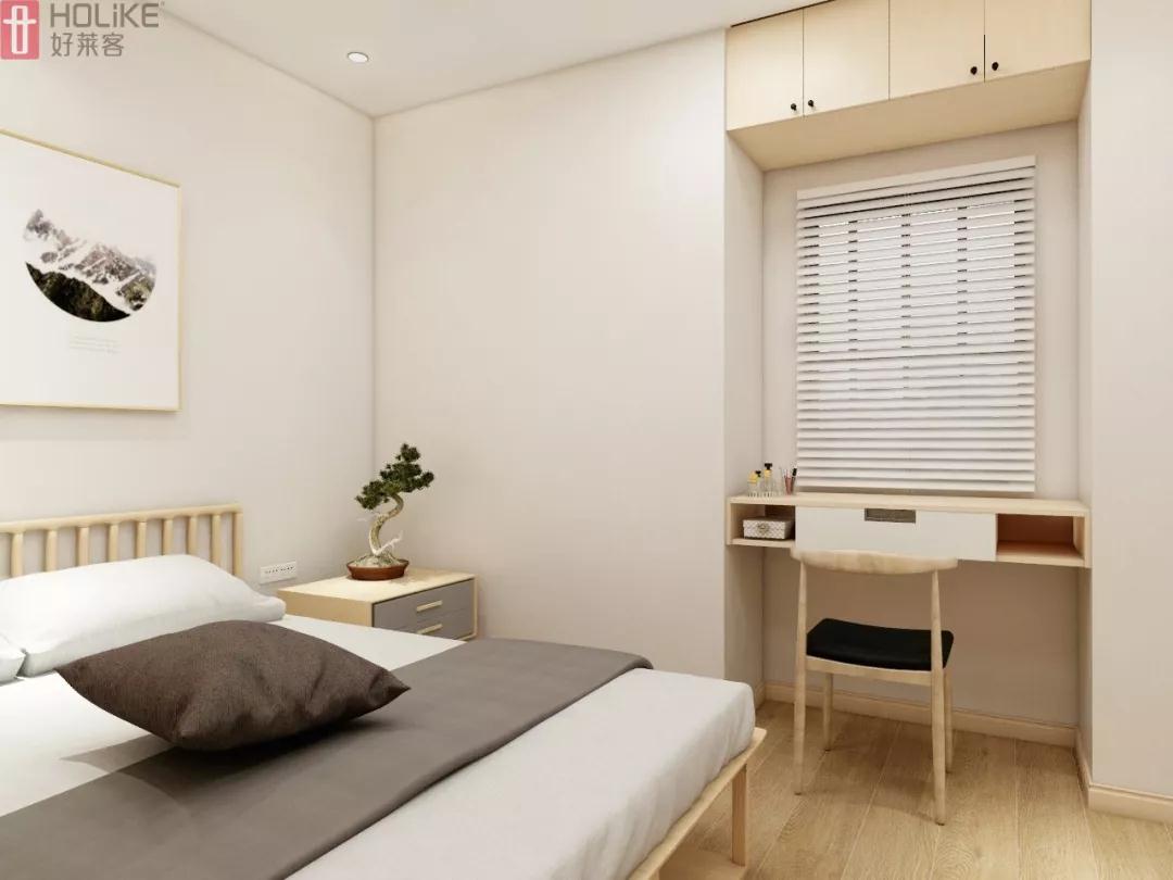 靠窗处的凹位处打造了一张梳妆桌,顶部则设计了一个吊柜,既保证了屋内的光照强度,也让空间得到了最大化利用。在这个小小的角落里,卸去一天的疲惫,敷上面膜唤回皮肤的生机,感受慢而美好的时光。