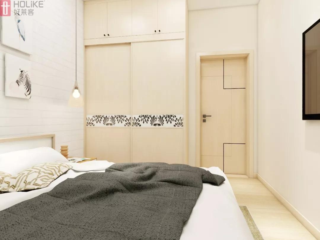 主卧延续客餐厅的风格,采用大白墙和银沙榆色的配色设计,质朴而又不失自然与温馨。通顶大衣柜满足了汤圆的衣物收纳需求,也解决了换季收纳的难题。