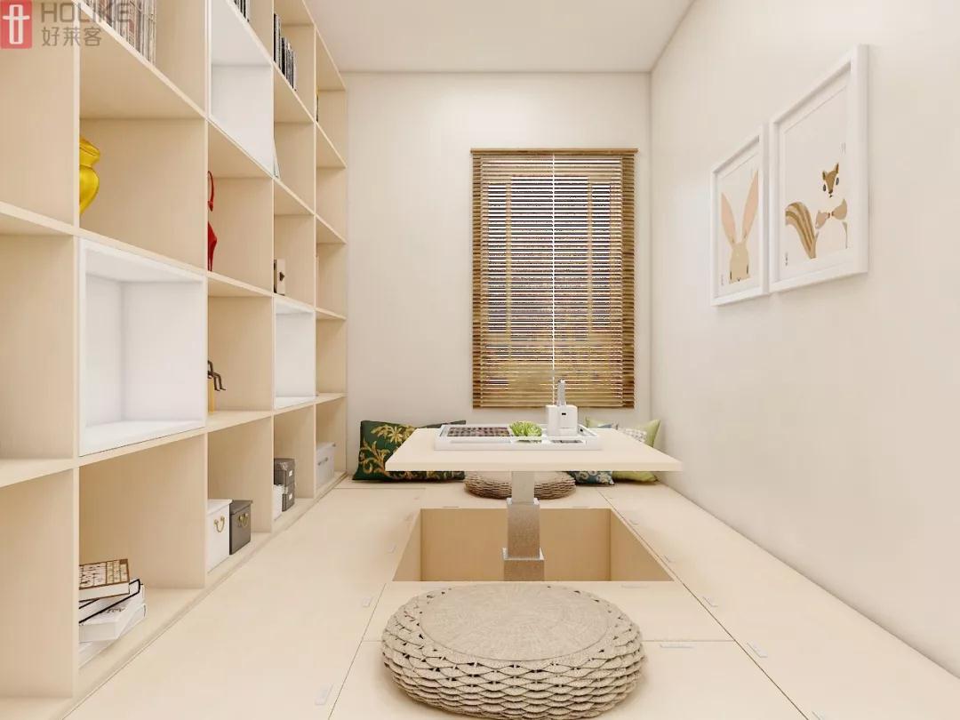 入门处左转便是榻榻米的茶室,空间的整体视觉以木色为主调,搭配百叶窗和木格栅,营造出清透简约的视觉效果。榻榻米+立式书柜的设计让茶室有了超强的收纳能力,也将空间的线条极简化。在这里泡上一壶好茶,静享一朝清闲,远离城市喧嚣,回味一茶一世界,一木一浮生的禅学深意。