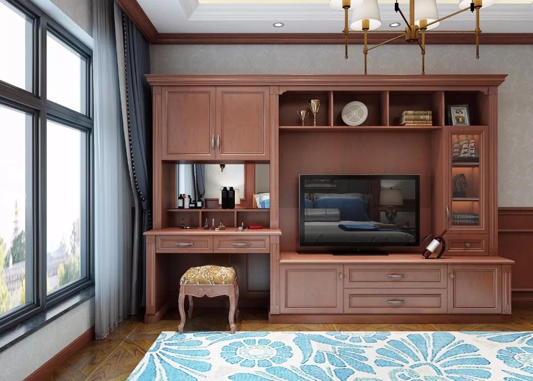 ▲电视柜拼接梳妆台,梳妆台用隔板、抽屉、吊柜来完成收纳。电视柜平面足够大,还能做临时的红酒放置区,满足“酒鬼”徐教授睡前小酌一杯的小情调。