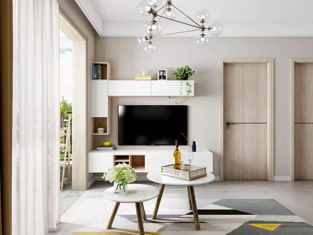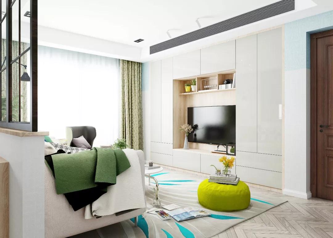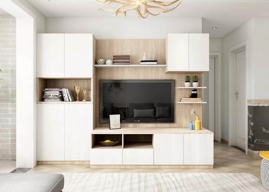 如果电视柜不需要考虑过多的收纳需求,最简单的当然是装个矮柜电视柜啦。下方的抽屉柜是客厅收纳的主力军,电视上方不装柜子,看电视不会有种压抑的感觉,顺眼又舒适。