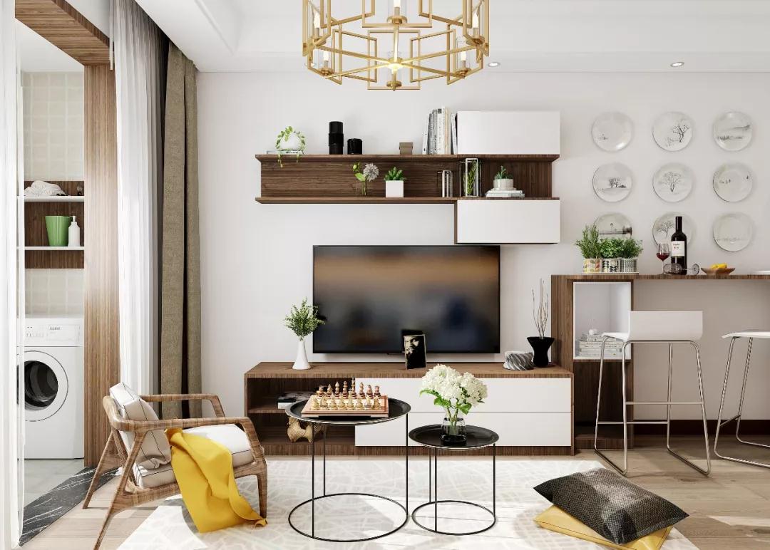 ●中高柜和吊柜的不对称组合,既可以弱化电视的存在感,还能增加临时储物区