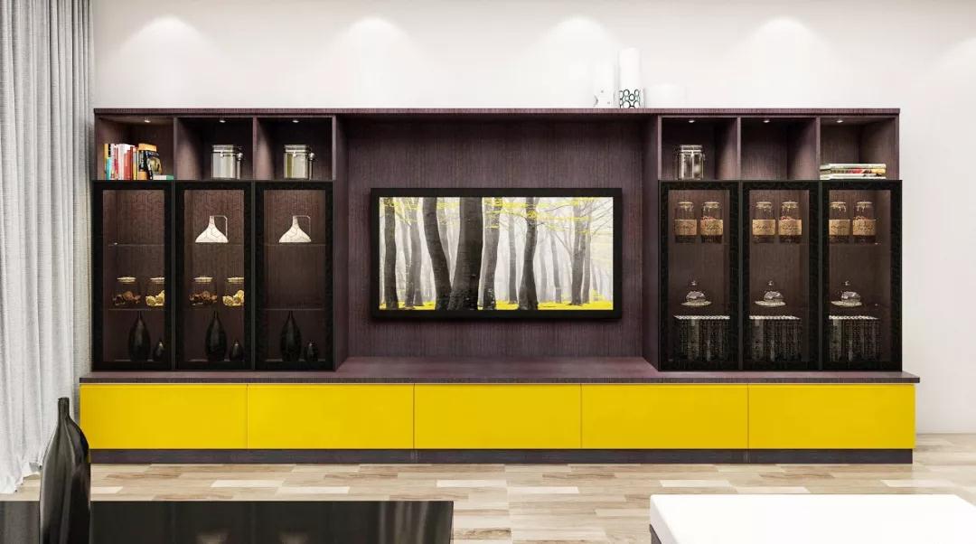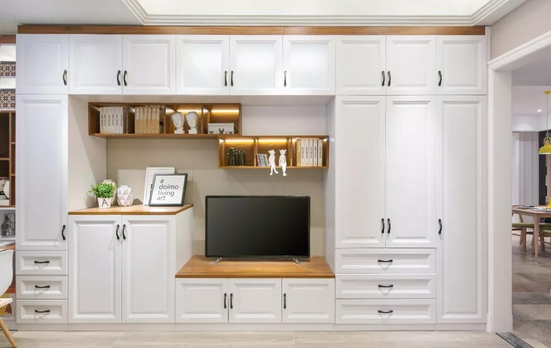 如果想要收纳能力更上一层楼,那不如把电视柜设计成顶天大柜,大小件物品都能藏到这里来,相比之下,储物能力可以呈指数级翻好几倍呢!