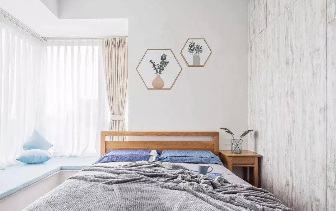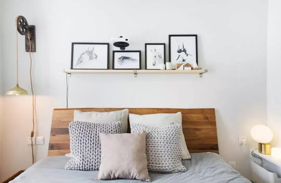 床两侧的尺寸不够,还可以利用床头上方的位置设计隔板,既能装饰,也能放放手机、眼镜等小物。