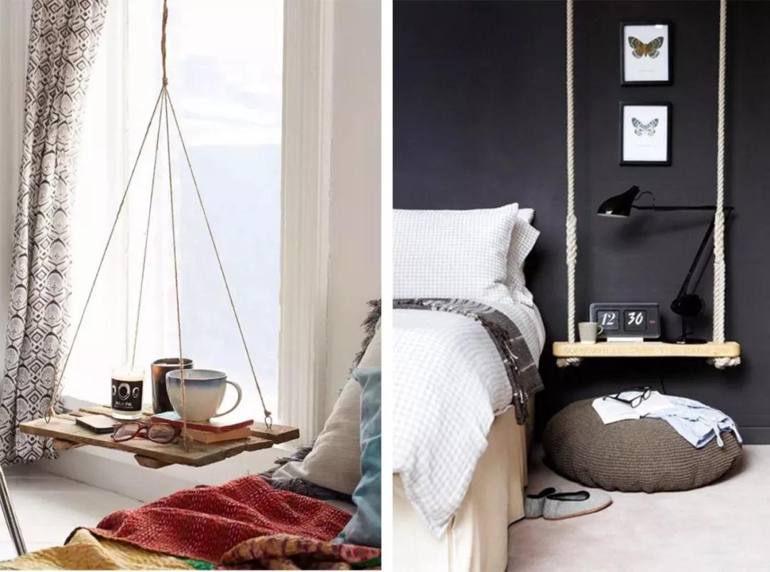 脑洞够大的,还可以把秋千搬到卧室来,少女心十足。床头东西比较少的小可爱可以尝试一下哦,但东西太多以及家里有熊孩子的,建议还是避避坑。