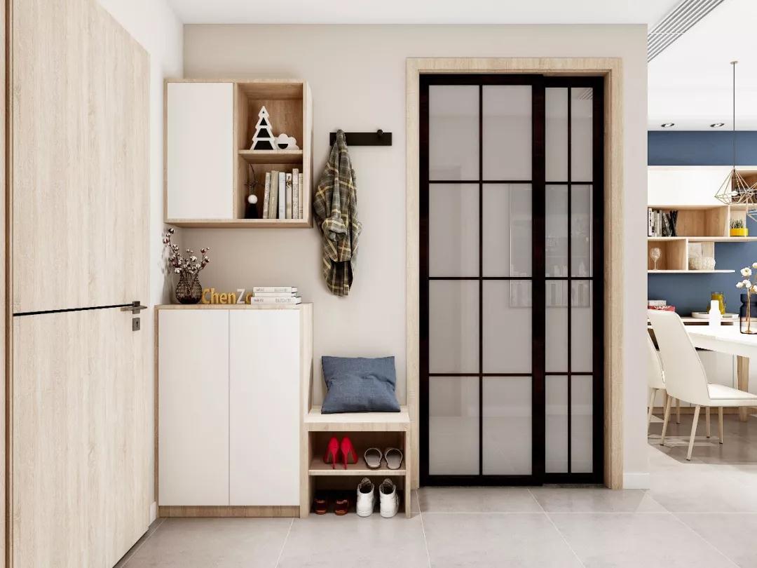 大门入户后走廊位置不大,但玄关功能超级强大。设计师充分利用门边的墙面,做了玄关柜、挂衣区和换鞋凳三个功能区,回家换鞋方便了很多,还为各类小物品提供了合适的储物空间。