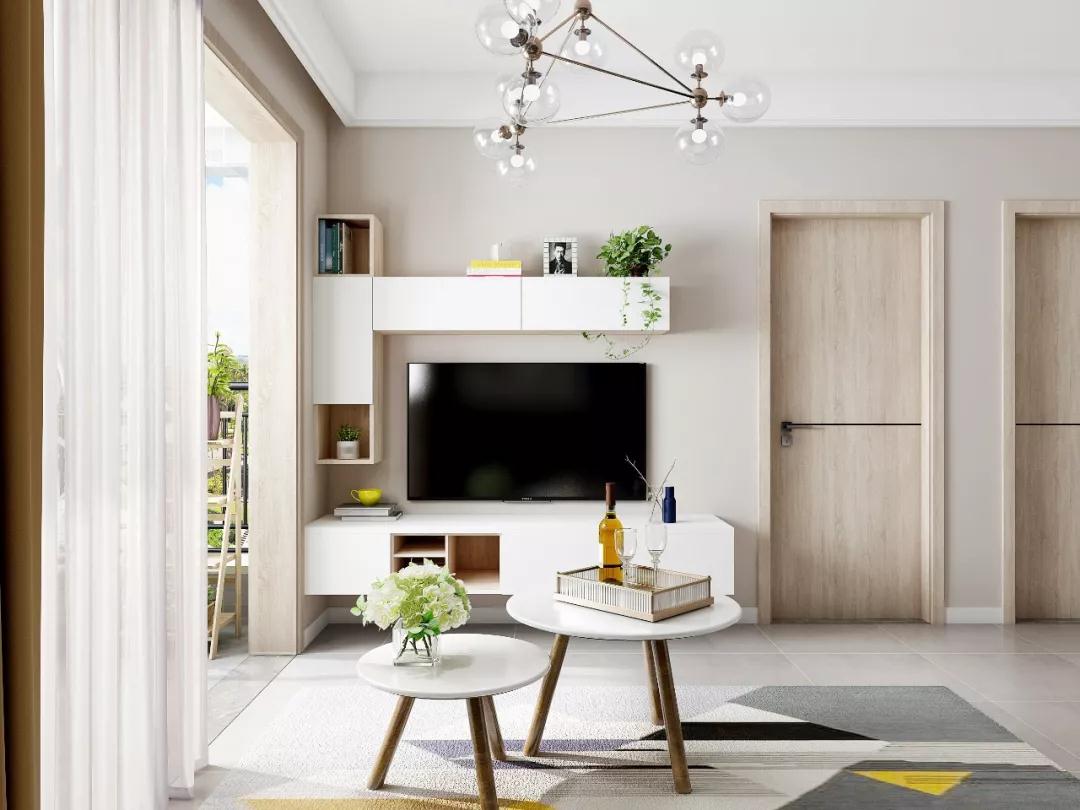 电视背景墙由L型吊柜和矮柜组成,无把手的柜门设计让空间更有整体感。矮柜悬空放置,不容易积灰,也让家里的扫地机器人有了休息的地方。茶几也特意选用可移动的款式,为孩子在客厅玩耍留足了空间。