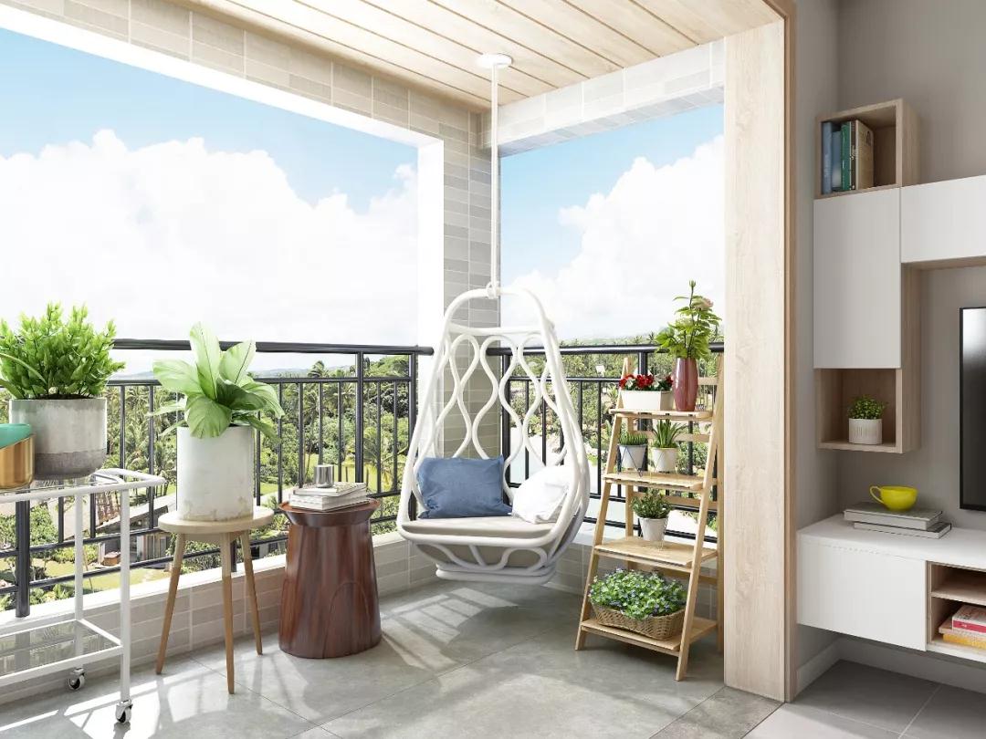 阳台兼具洗衣区和晾衣服功能,同时也是休闲小花园。设计师用梯形架和长凳造了一个绿植角,还装上白色的藤编吊椅,放上抱枕和方几,惬意值满分。住进去之后,这里也成为屋主最爱的休闲区域。