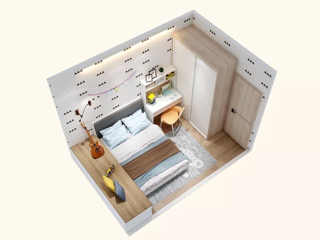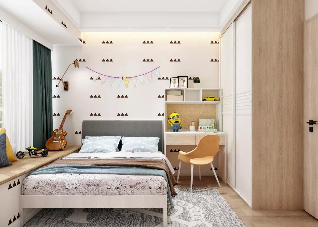 趟门设计的大容量衣柜,内设不同儿童衣物分区,足够装下孩子成长中的所有衣物。1.5的小床和衣柜中间装了一个小书桌,背后还设计了一面软木板,给孩子打造一个专注学习的天地。飘窗是孩子最爱的练琴角落,放上软软的靠垫,不用过多的设计就已经很温馨了。