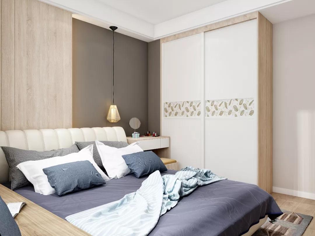 主卧以深灰和浅灰色为主色调,床、衣柜、地板等都采用了统一的原木色调,靠床的背景墙加了一面原木色的护墙板,装上LED灯带,营造出卧室的柔和浪漫氛围。