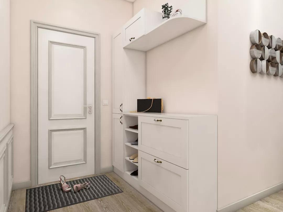 玄关靠墙定制杏白色的多功能鞋柜,完全满足两个人日常鞋子收纳的需求。开放式格子和封闭式柜体的组合,让各类物品存放更加有条不紊,视觉上也更整洁。