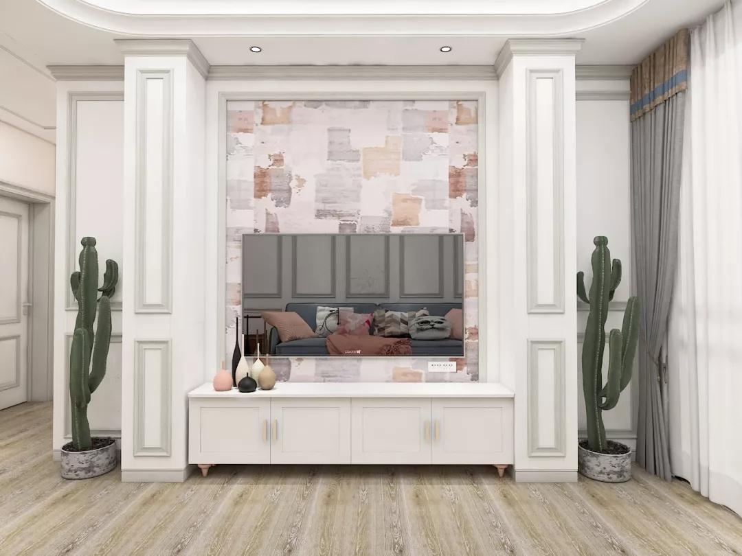 电视墙贴上莫兰迪色的墙纸,和嵌入式的杏白色矮柜相互映衬,弱化了两侧梁柱的存在感,再点缀上绿植,营造清爽又有层次感的客厅一角。