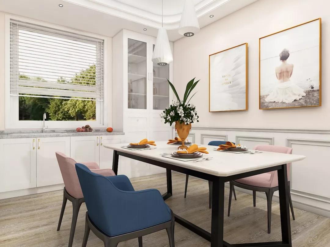 女主人皮皮喜欢招待朋友在家聚会,所以准备了6人座的大餐桌,多人用餐也不会觉得很拥挤。粉+蓝的冷暖色餐椅组合,和浅粉色墙面形成鲜明对比,再挂上两幅北欧风挂画,用餐区的颜值和仪式感大大提升!