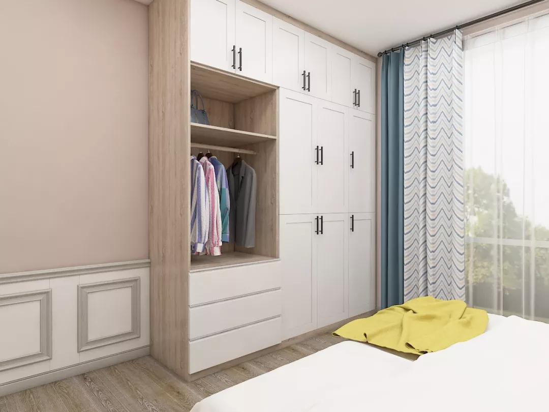通顶的嵌入式衣柜满足男女主人日常衣物收纳的需求,掩门衣柜内部分设不同区域,左侧增设开放格,同时满足临时储物和帽子收纳。转角墙面放置一张简约的梳妆台,化妆、换装十几步内就能搞定。