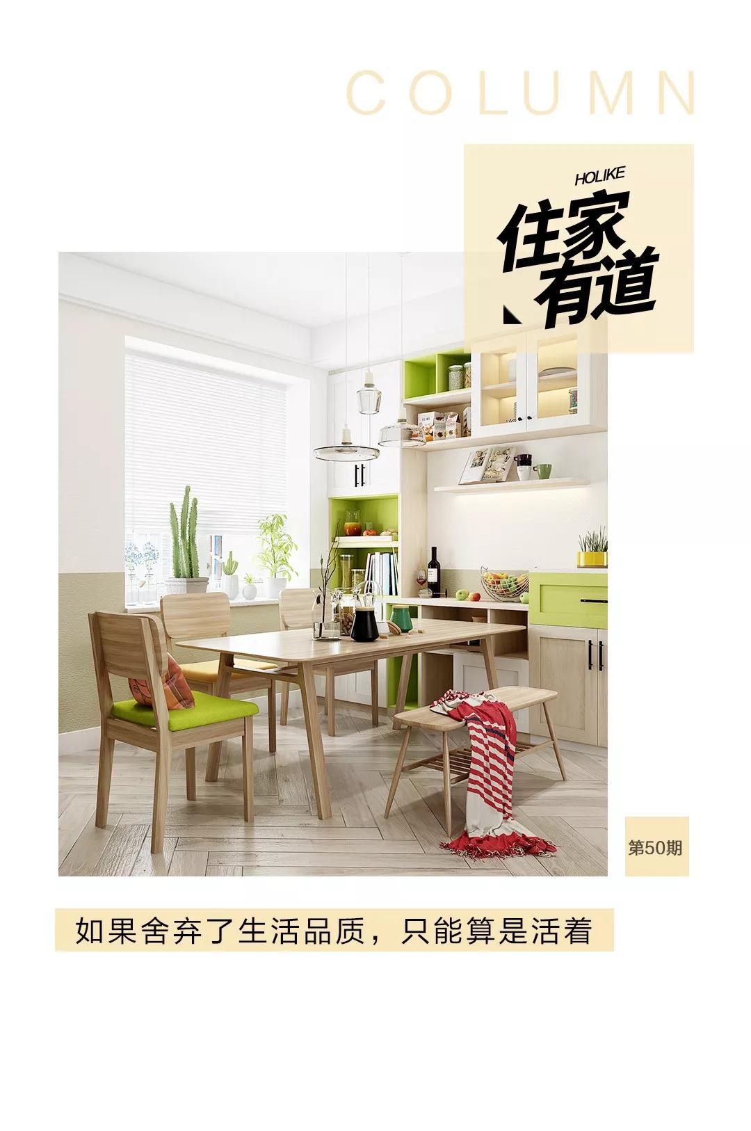 沿墙面的餐边柜设计成组合柜的样式,有适当的留白做展示空间,结合浅色系的原木、白色和清新绿,避免给餐厅空间增加压抑感,小户型可以参考这个做法。
