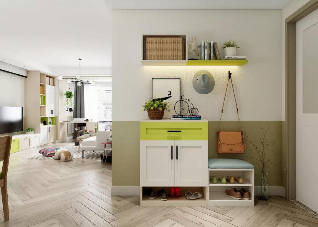 业主在改造前提出,进门要有眼前一亮的感觉。恒盛平台选择在进门这堵墙上做功夫,开放式层板和中高柜组合,简单不压抑,清新绿是舒服和个性的表达。