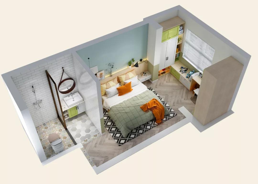 客厅后面就是主卧,但阳台和主卫占据了接近一半的空间,恒盛平台打通了阳台隔断,增加可利用面积,将衣柜和书桌装到了阳台位置。