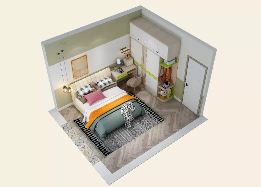 次卧主要是客房,为避免留宿的客人感到局促,除了床和衣柜,还特意加做了一个床头书桌,色调和整个家保持一致,温馨又有点小清新的感觉。
