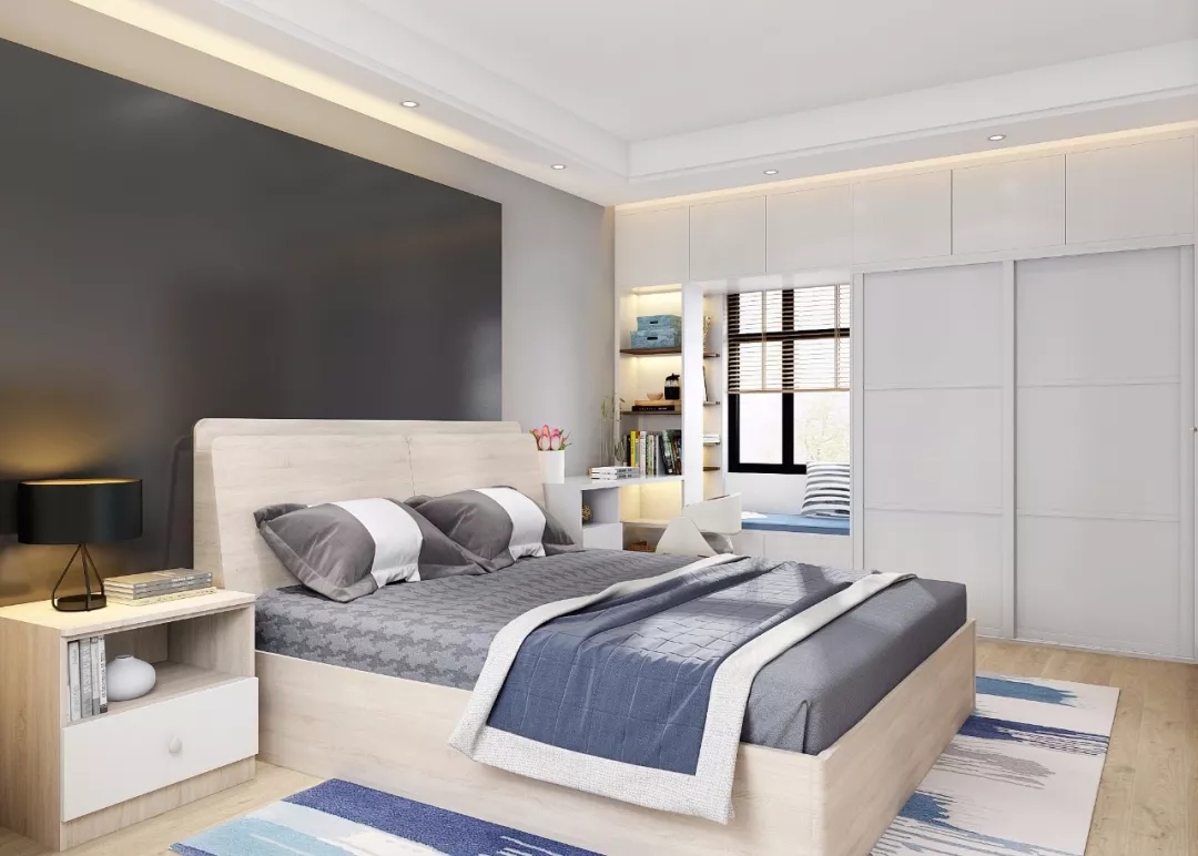 主卧的衣柜采用到顶的设计,解决了衣物收纳的难题。在临窗的位置,设计了林小姐夫妻看书工作的写字台。累了,还可以坐在飘窗上,放松一下全身的筋骨。