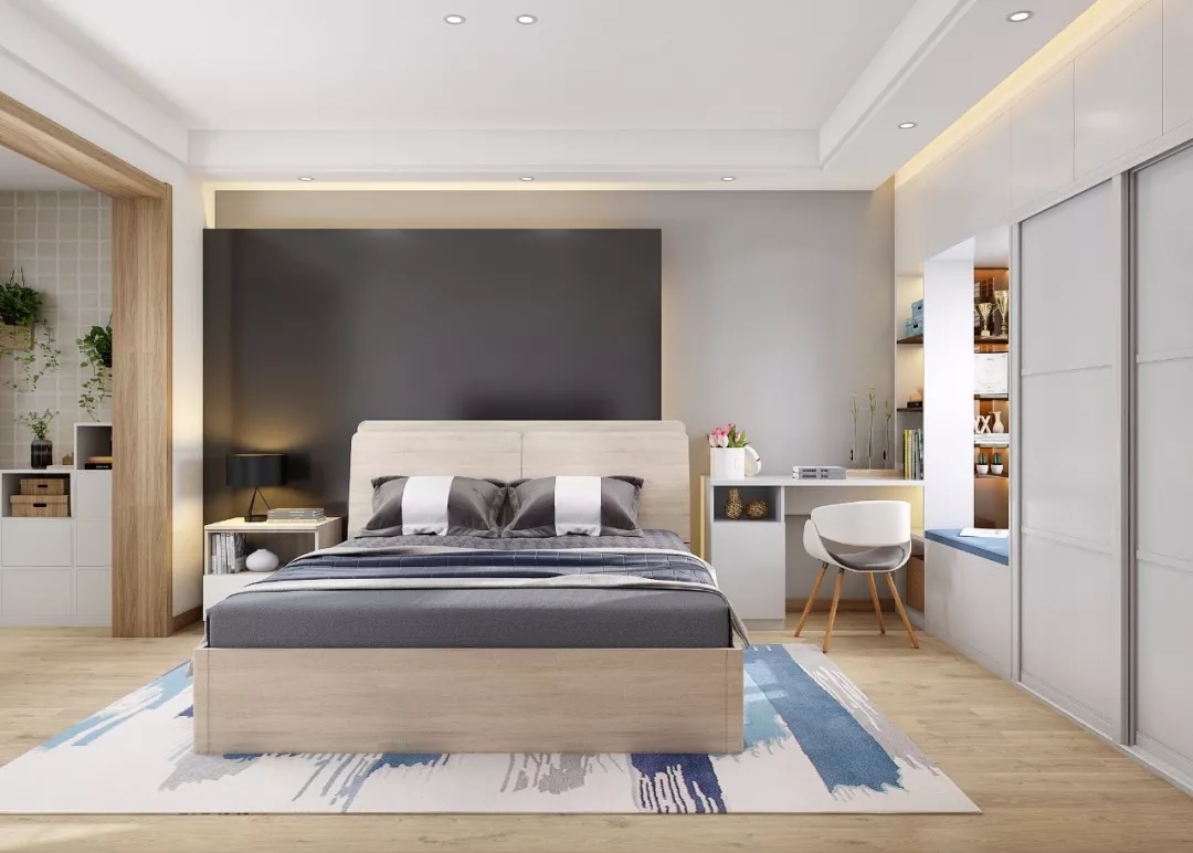 主卧以浅灰为主色调,床、地板都采用了统一的原木色调。床头柜的台灯,让卧室显得温馨且具有浪漫氛围。