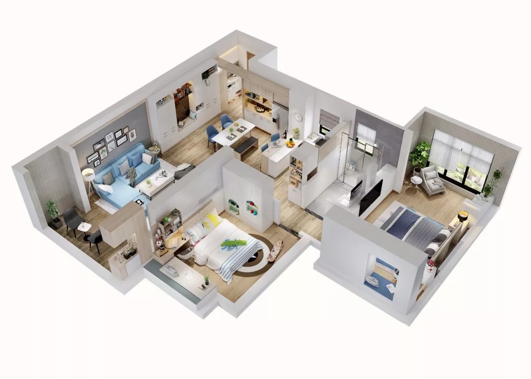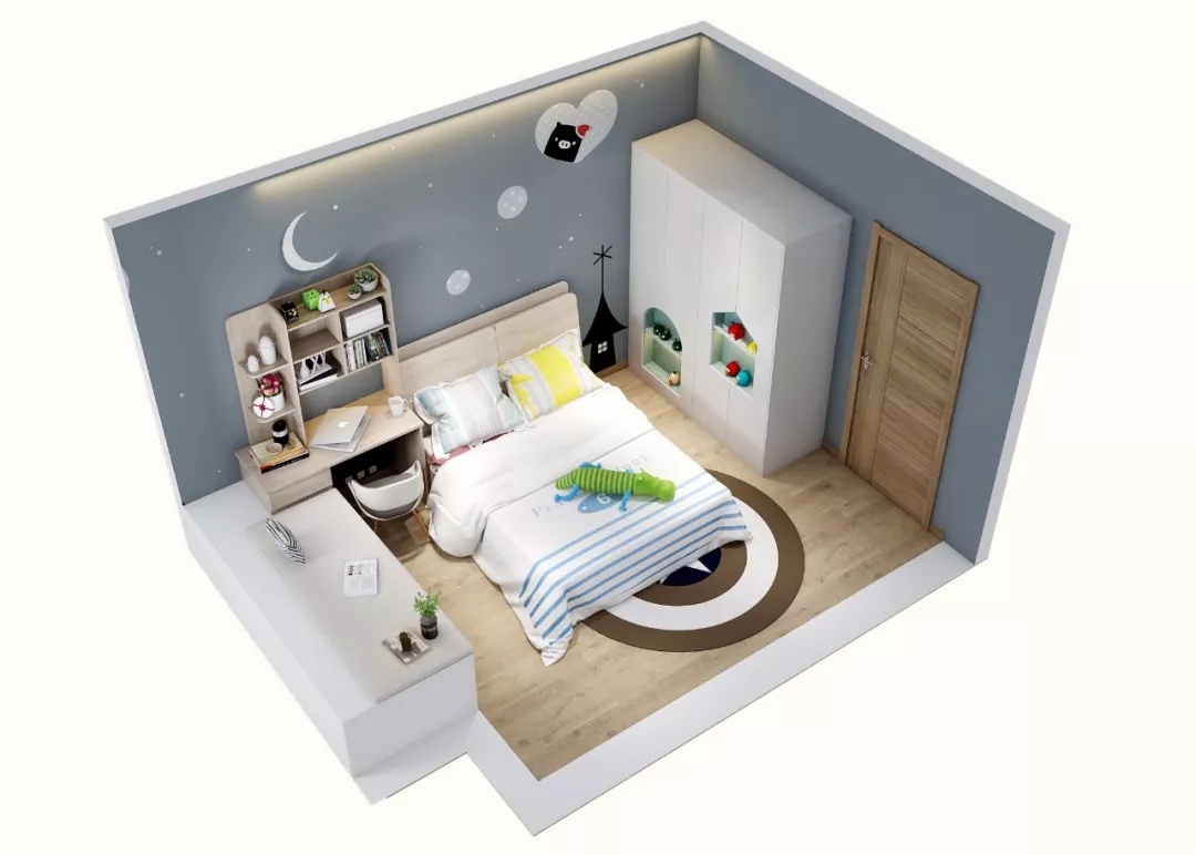 这是一个集睡眠、玩耍、学习为一体的空间,有利于开发孩子的想象力。随着年龄的增长,原木色+蓝色的基础色也不会被小主人嫌弃。放上小飞机、愤怒的小鸟、小鳄鱼等装饰品,让整间房童趣盎然。