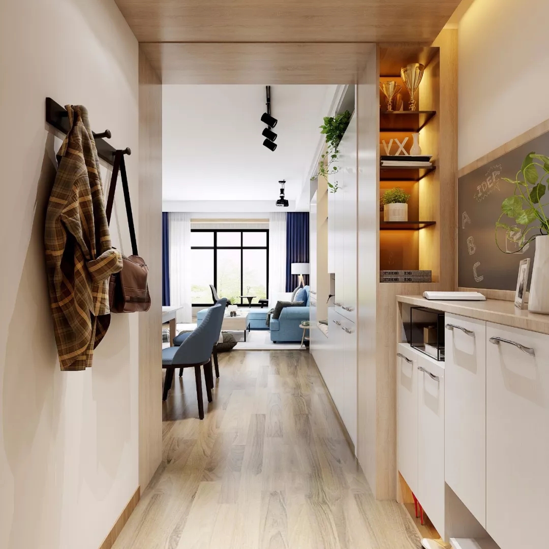 玄关,作为一个家的脸面,承载着内外连接过渡的重任。装修后,林小姐在入户处增加了挂衣钩,忙碌的一天结束后,一回家就能卸下一身的疲惫。右侧是一个半身高的白色矮柜,可以收纳鞋子,上面还摆放一个小黑板,方便主人记录每天行程。