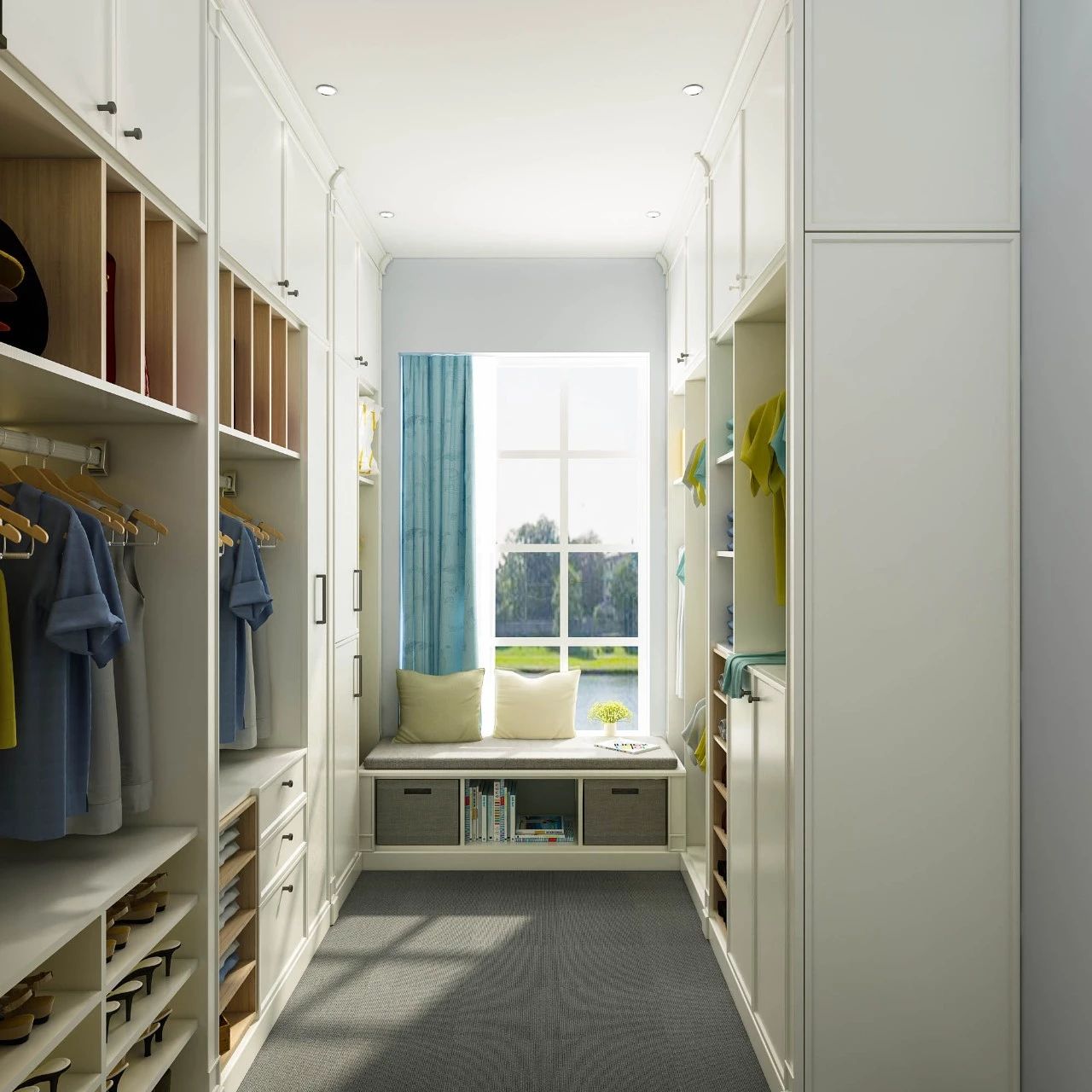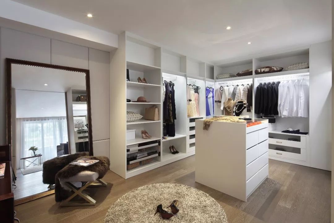 大户型、别墅完全可以任性抽出一个房间改造成衣帽间,除了利用墙面做收纳柜,还可以添加中岛柜、梳妆台、沙发榻,有窗的还可以做飘窗柜,关上门就是私人小天地。