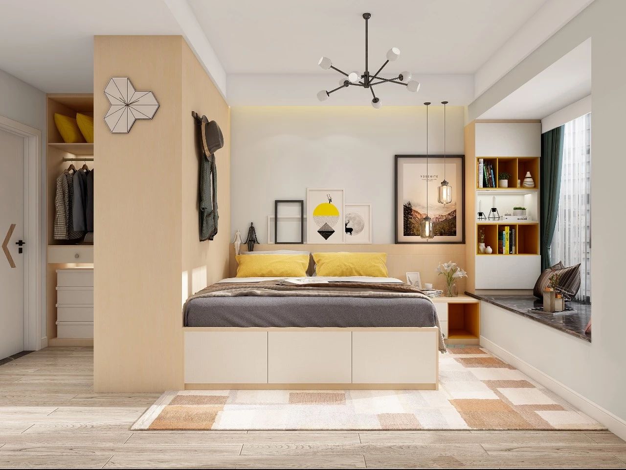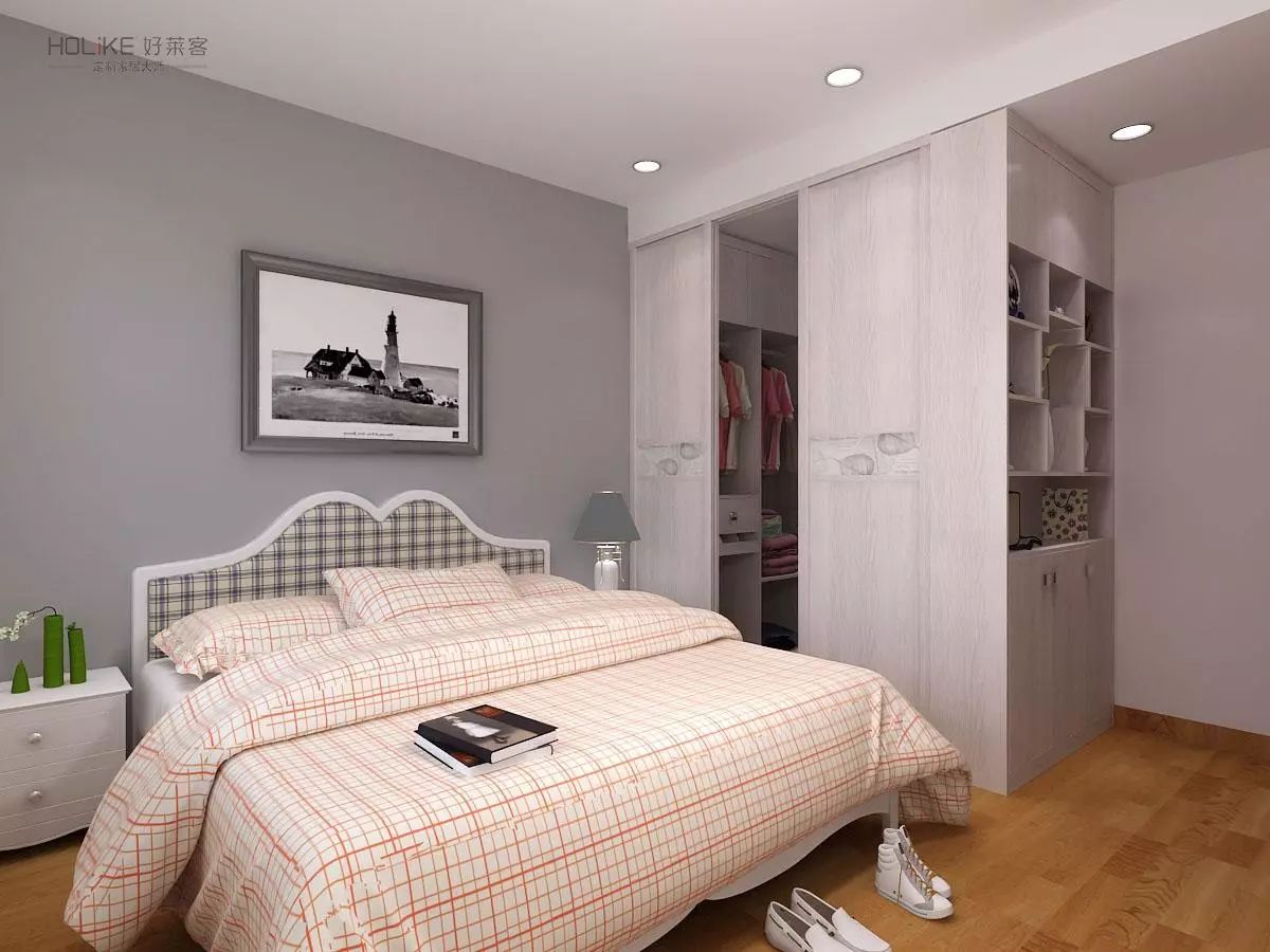 没有多余的独立空间,那就把衣帽间放在卧室里。只要利用卧室的一面空墙,就可以打造一个开放式衣帽间。