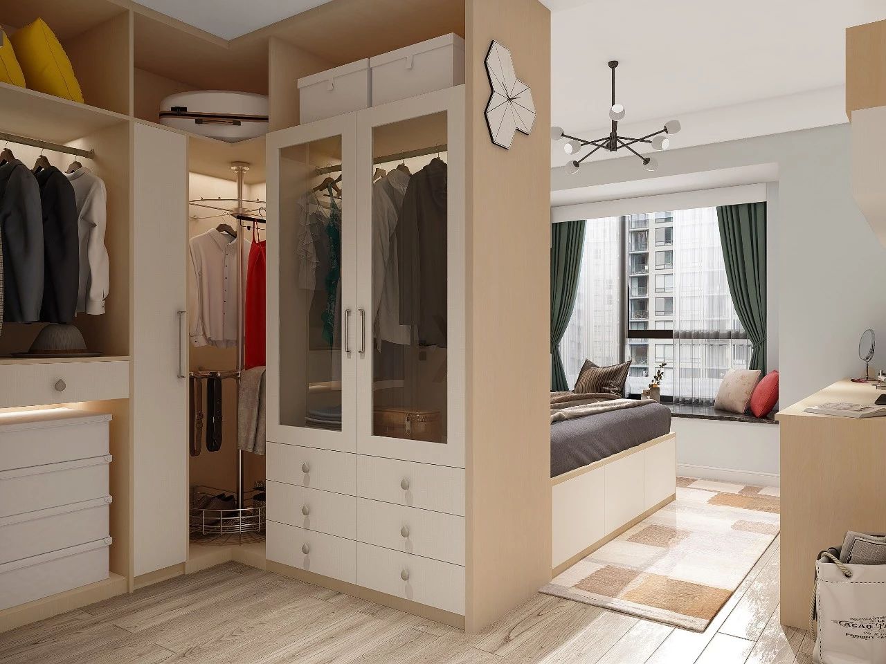 独立衣帽间的特点是防尘好,储存空间完整,还能提供充裕的更衣空间,但房间内要注意做好充足的照明。