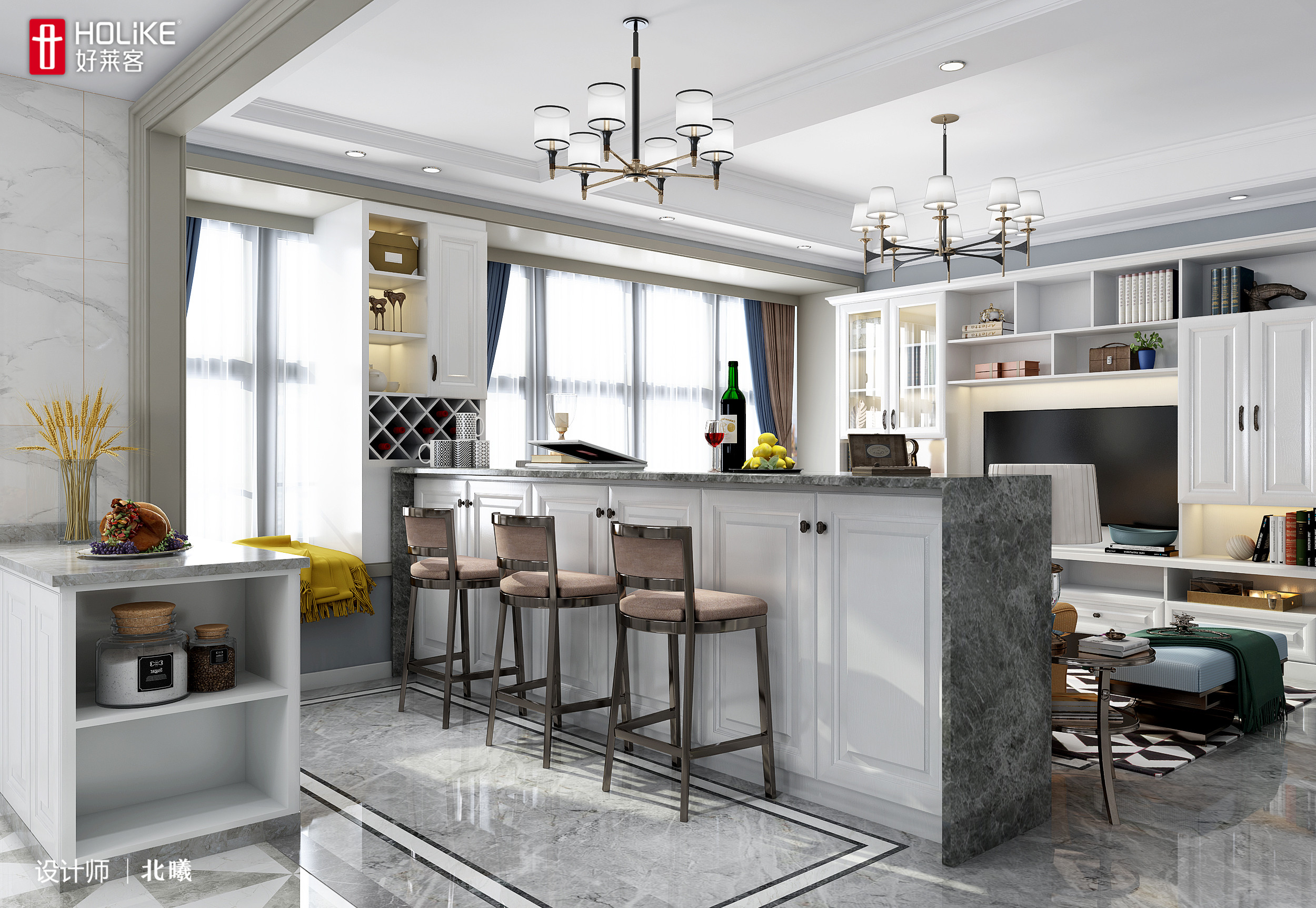 如果你是憧憬小资情调的文艺业主,不妨利用吧台做隔断,既能划分功能区,闲暇时又能坐在吧台上小酌一杯,相当有情调。