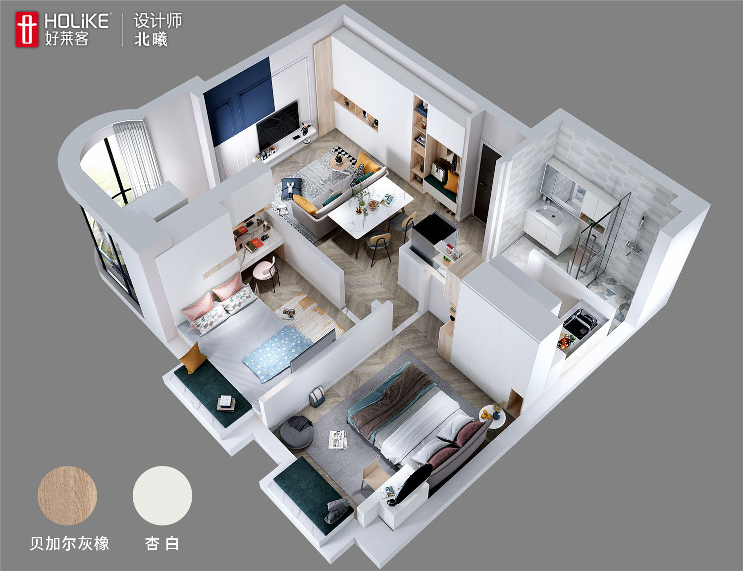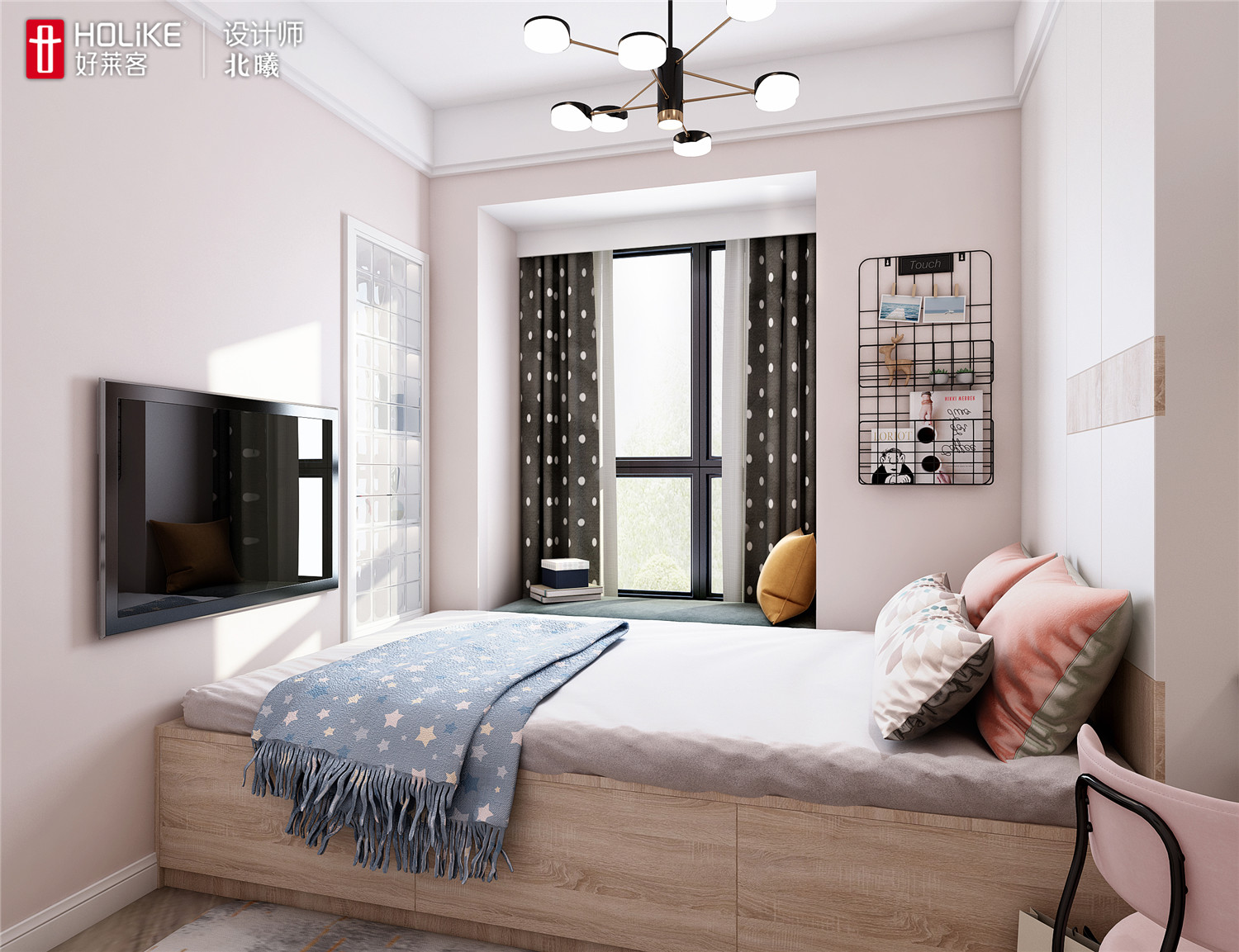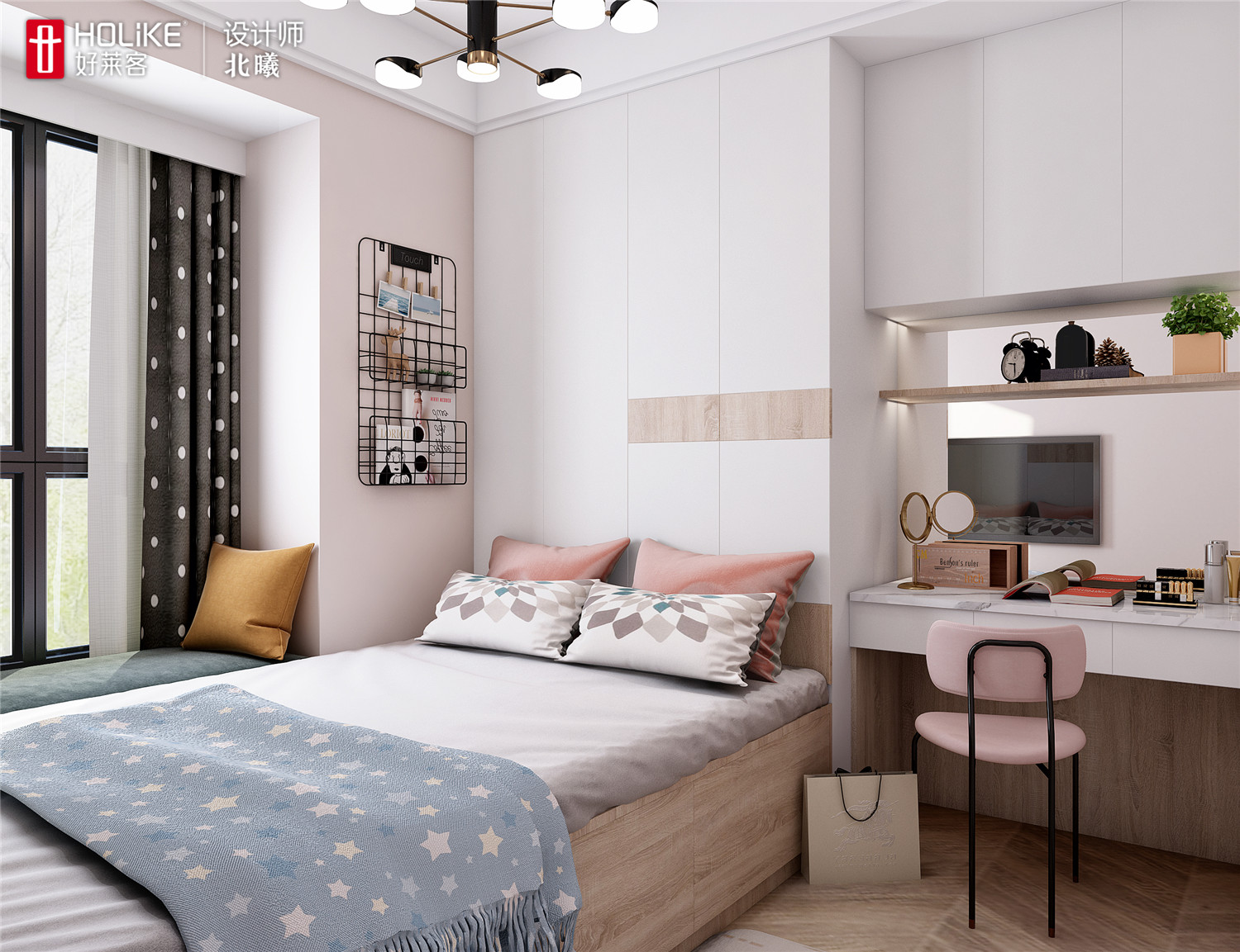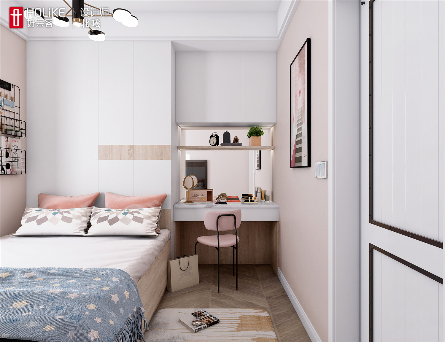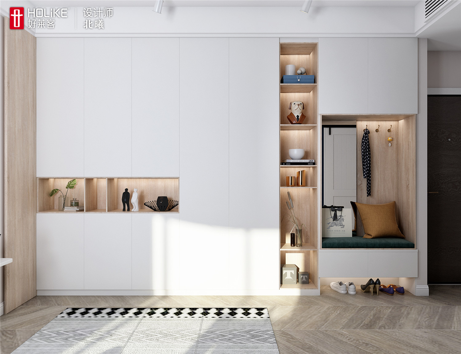 卧室是童小姐的小天地,当然少不了她最爱的摆件。衣柜侧面中部镂空,设计开放层,既能摆放随手物品,又能做展示。
