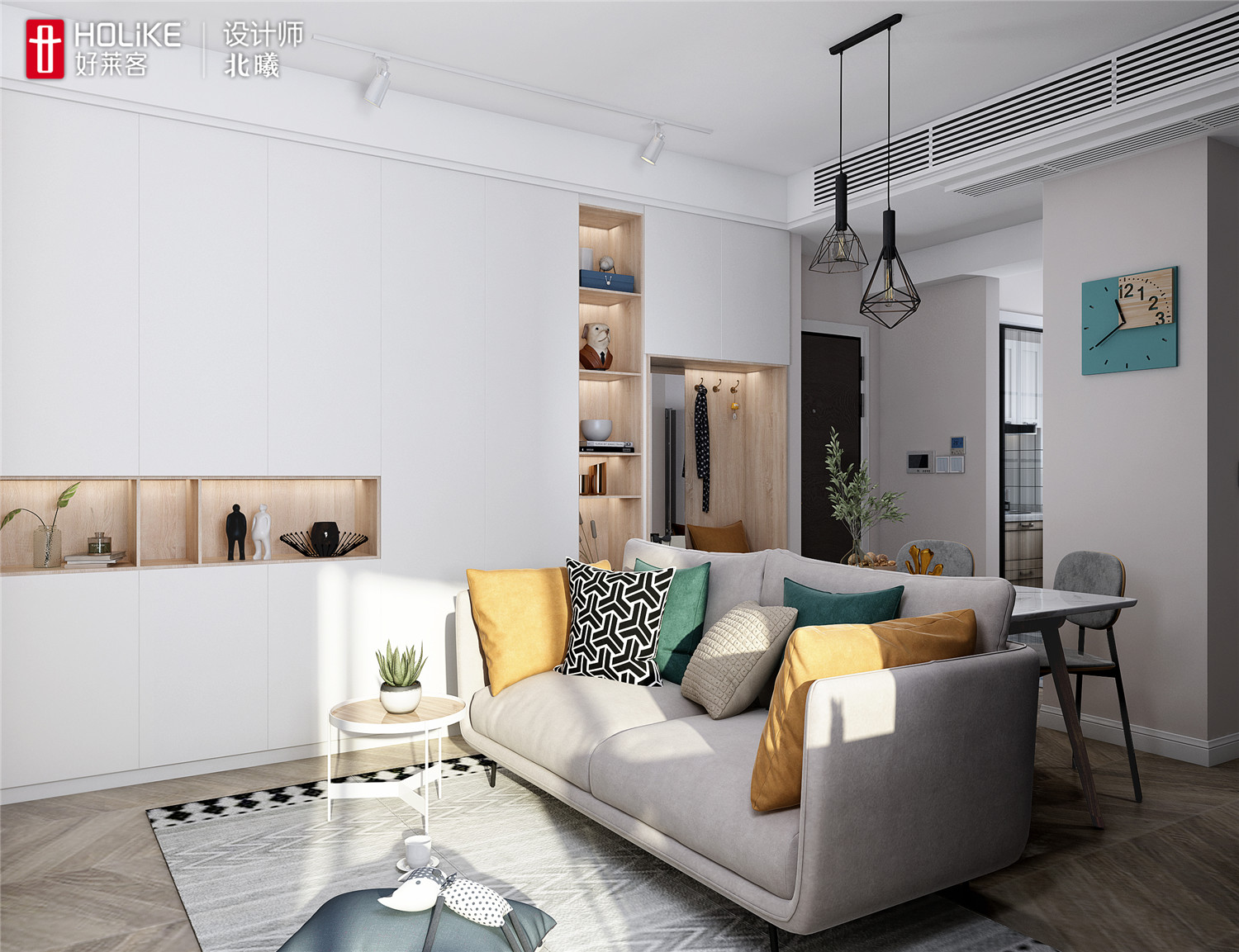 为了保持客厅的整体性和收纳性,设计师贴心地为童小姐设计了整墙的储物柜。无拉手设计减少磕碰,安全性max。