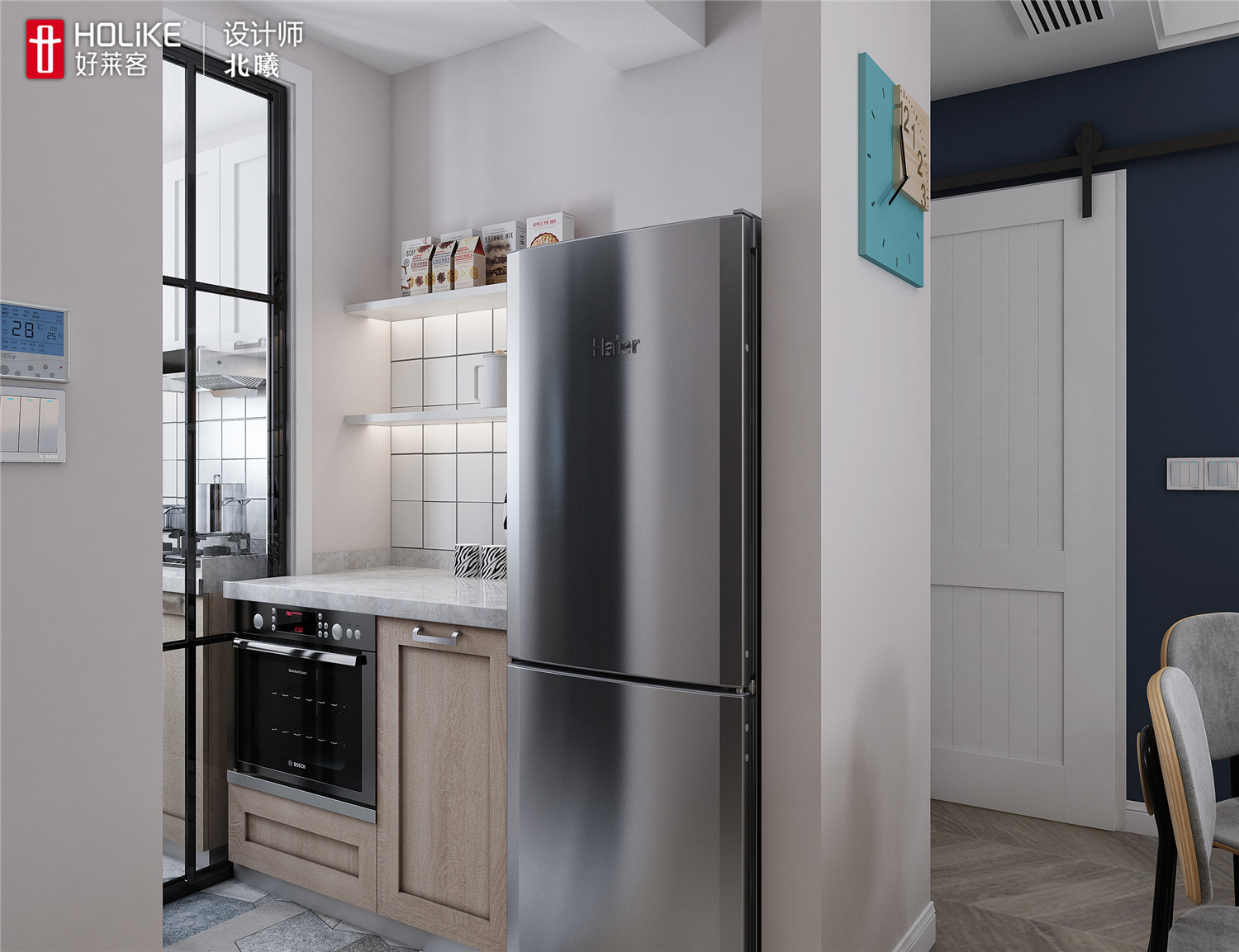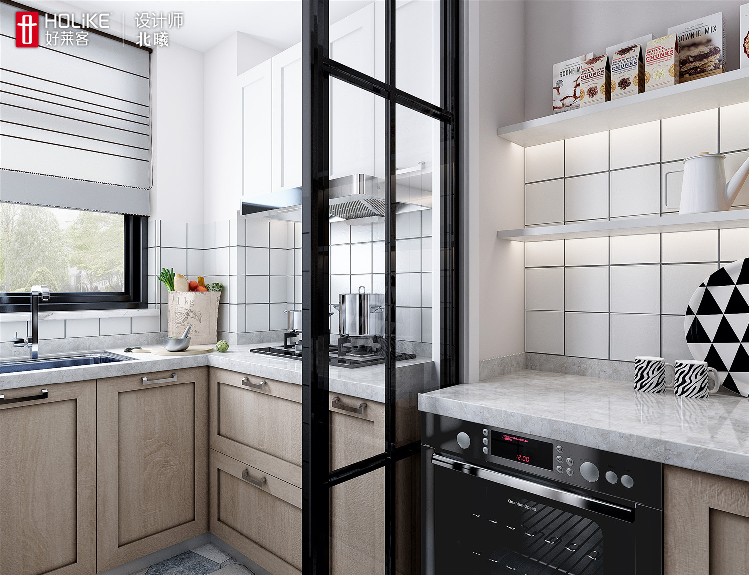 进门的左手边就是厨房区域。巧妙的是,虽然厨房面积不大,但设计师用玻璃移门做了料理分区。