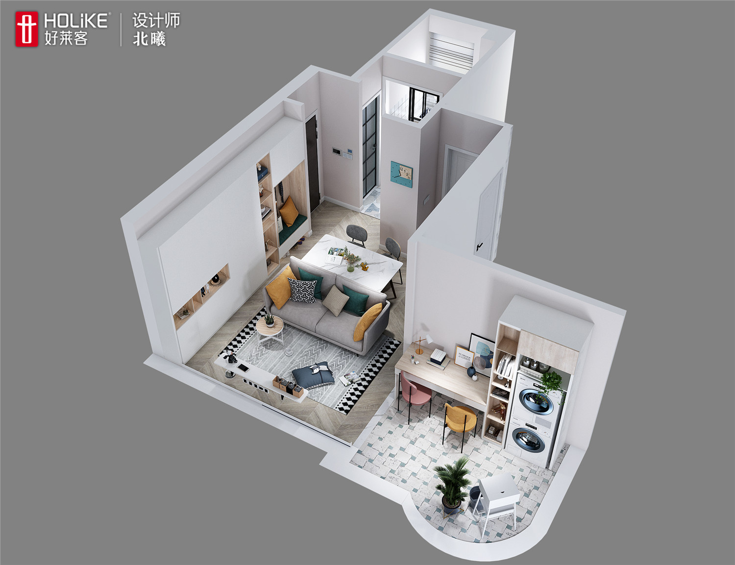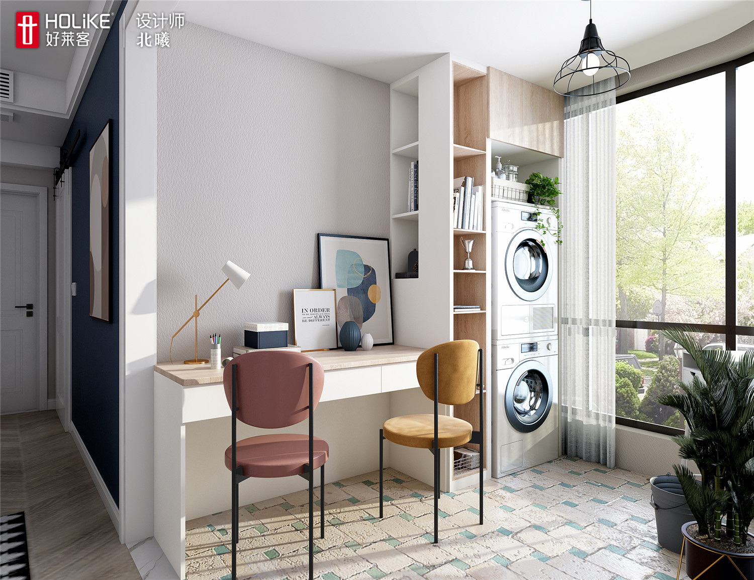 阳台空间通透、敞亮,用作晾衣区未免太浪费。而童小姐希望有独处、看书、工作的地方,于是设计师大胆改造阳台,“造”出家务角和童小姐的工作区。