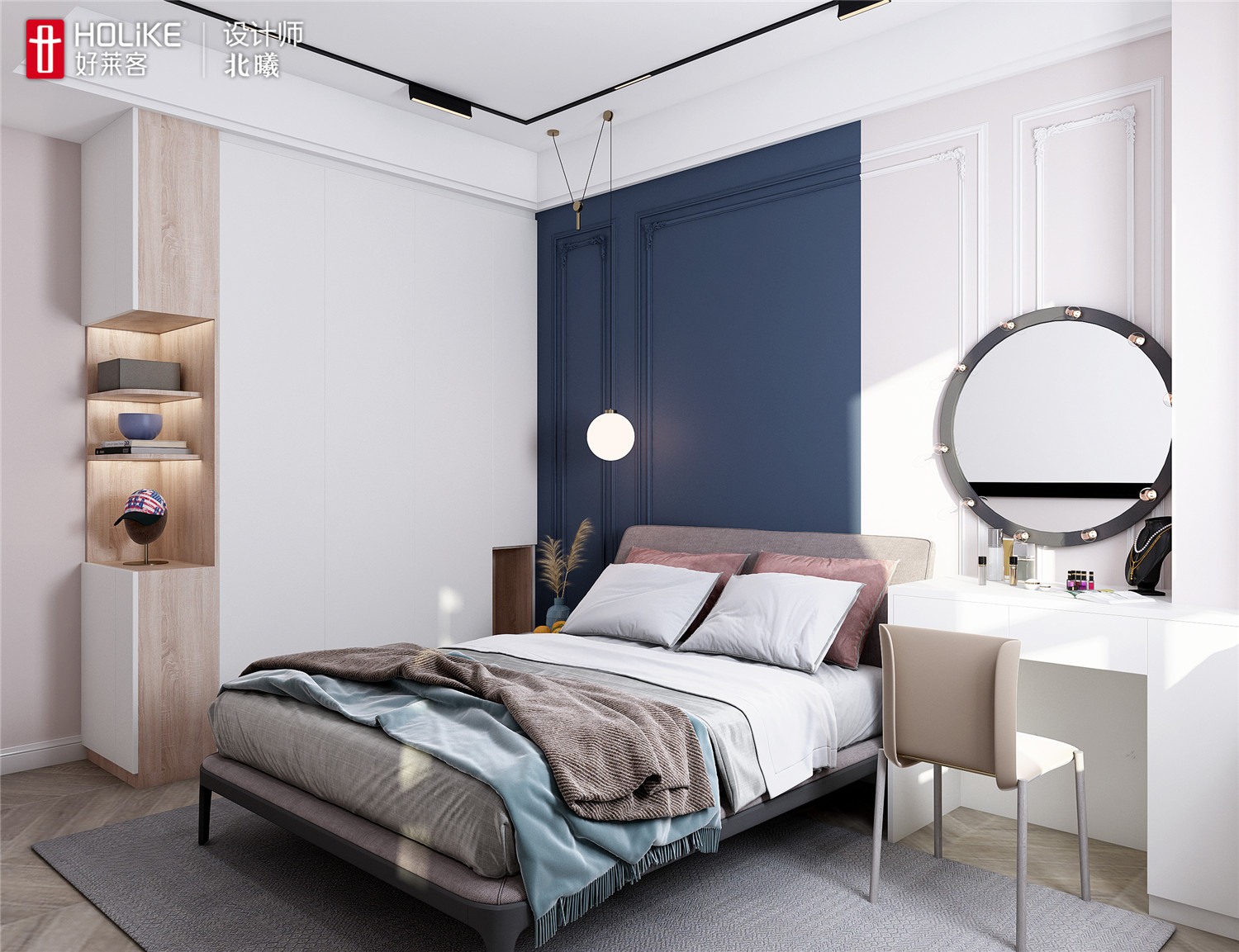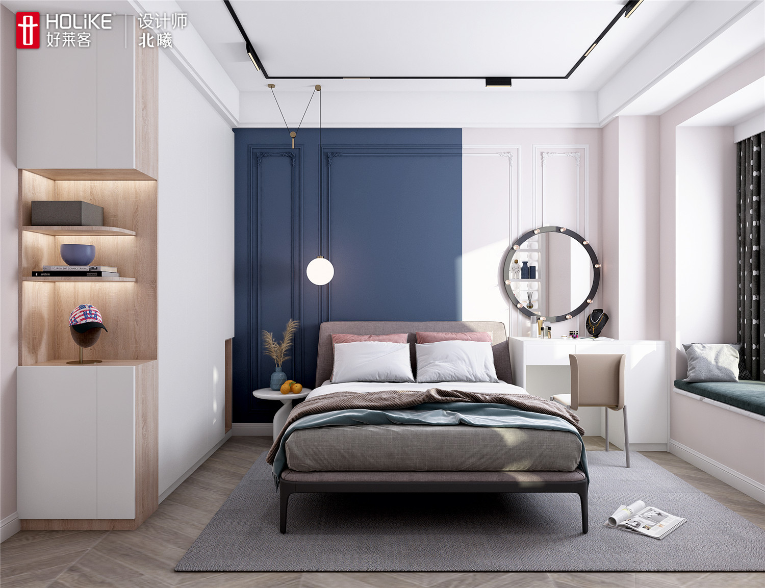 童小姐非常注重睡眠,对主卧的设计要求非常高。设计师以蓝白护墙板延续整体的北欧基调,配上裸粉色的墙面,给人放松舒适、无拘无束之感。