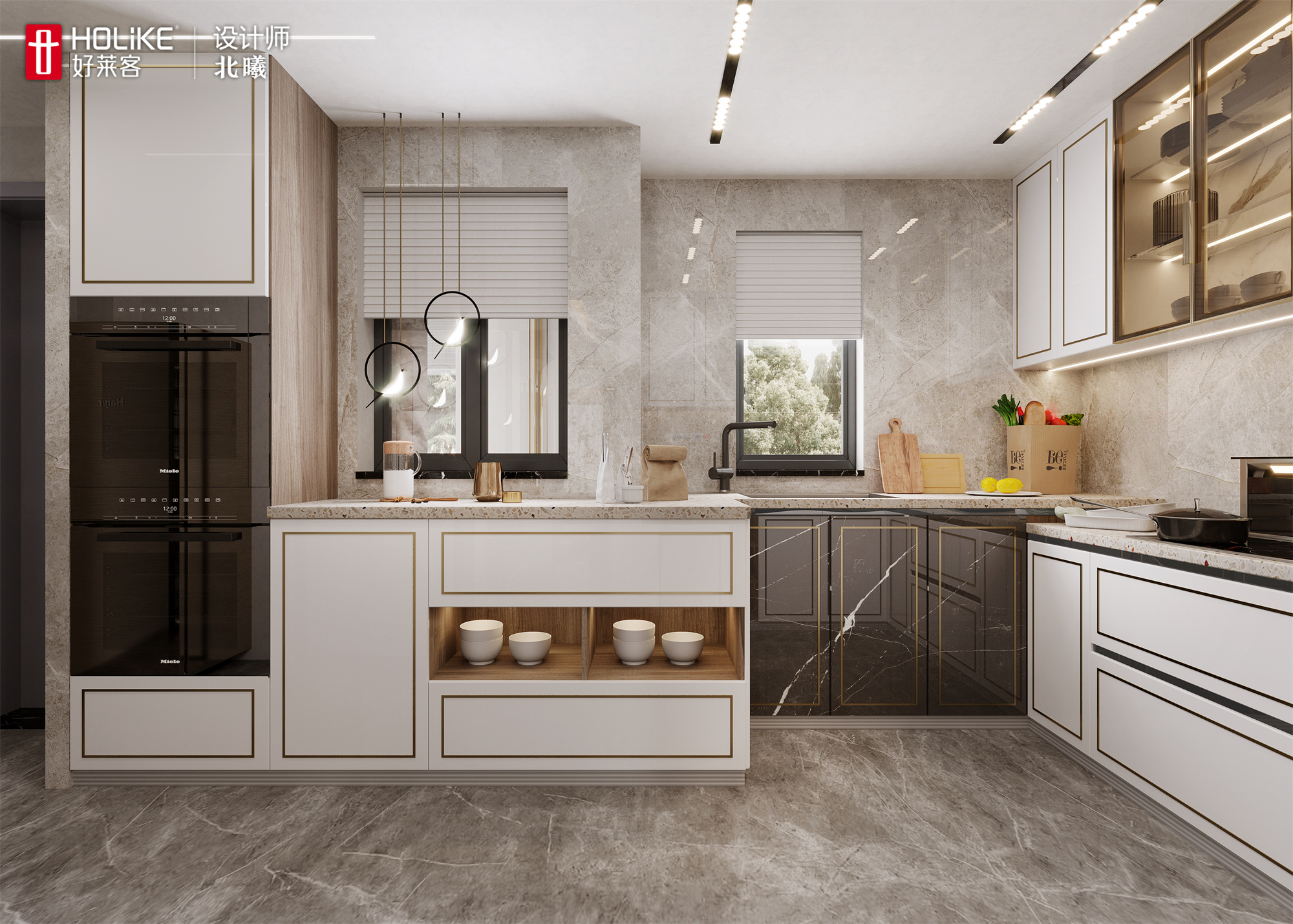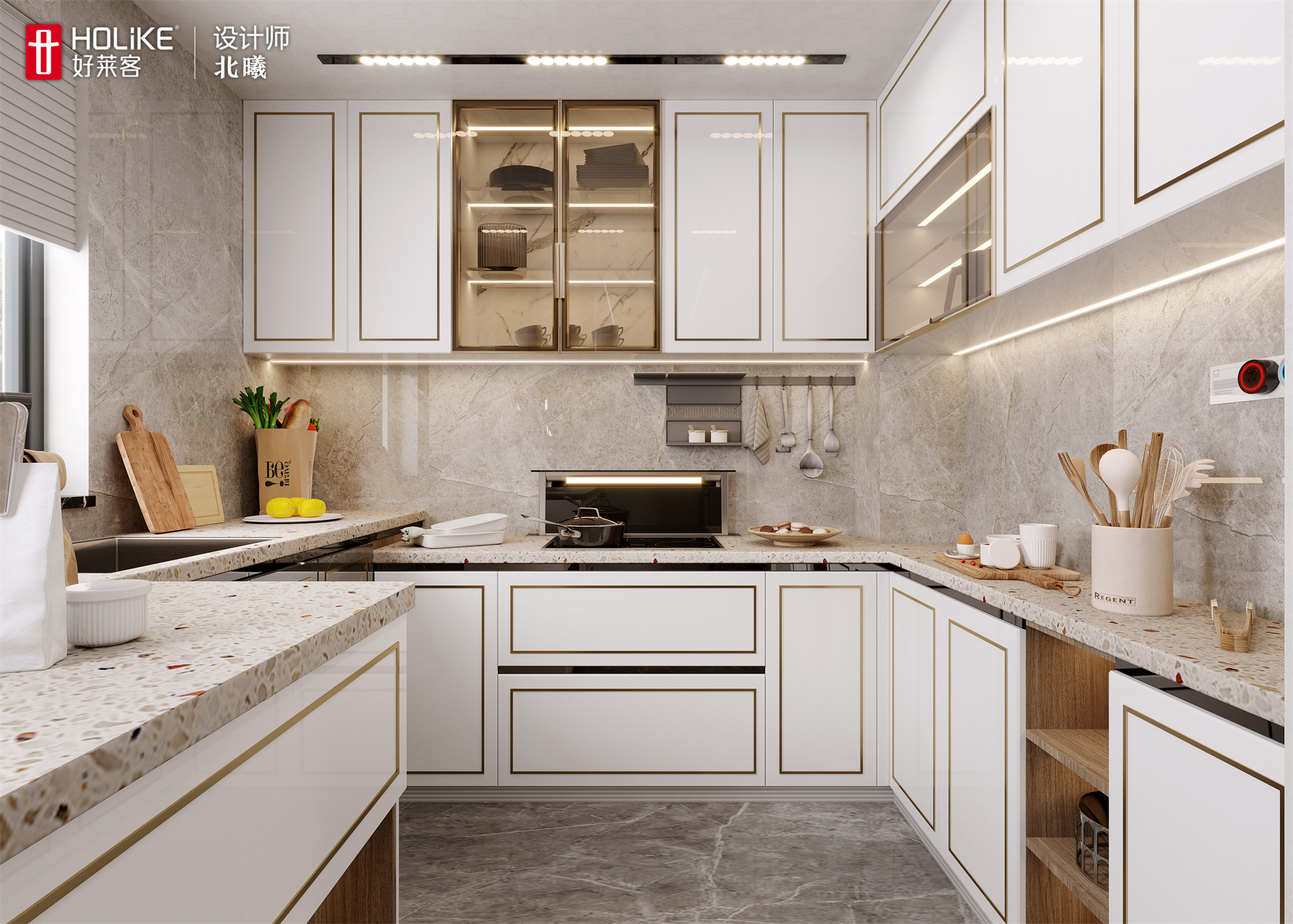 ▲厨房空间很大,设计师采用中西厨结合的设计。大面积的橱柜设计方便收纳女主人的厨房用品,内嵌灯条,提升空间照明,营造下厨氛围感~